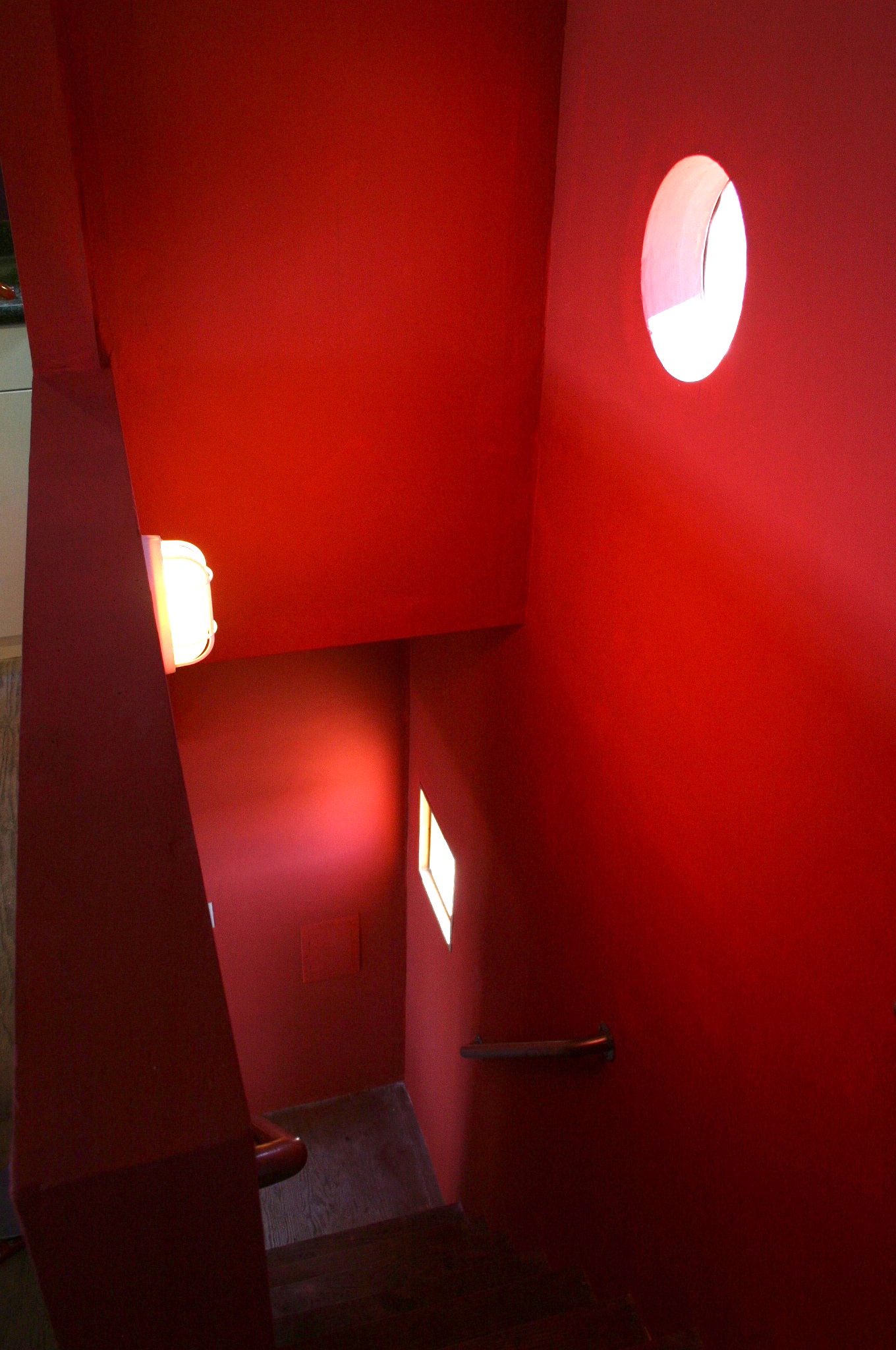 A view of the stairwell from below. A ray of sunlight projects a circle from the window onto the opposite wall