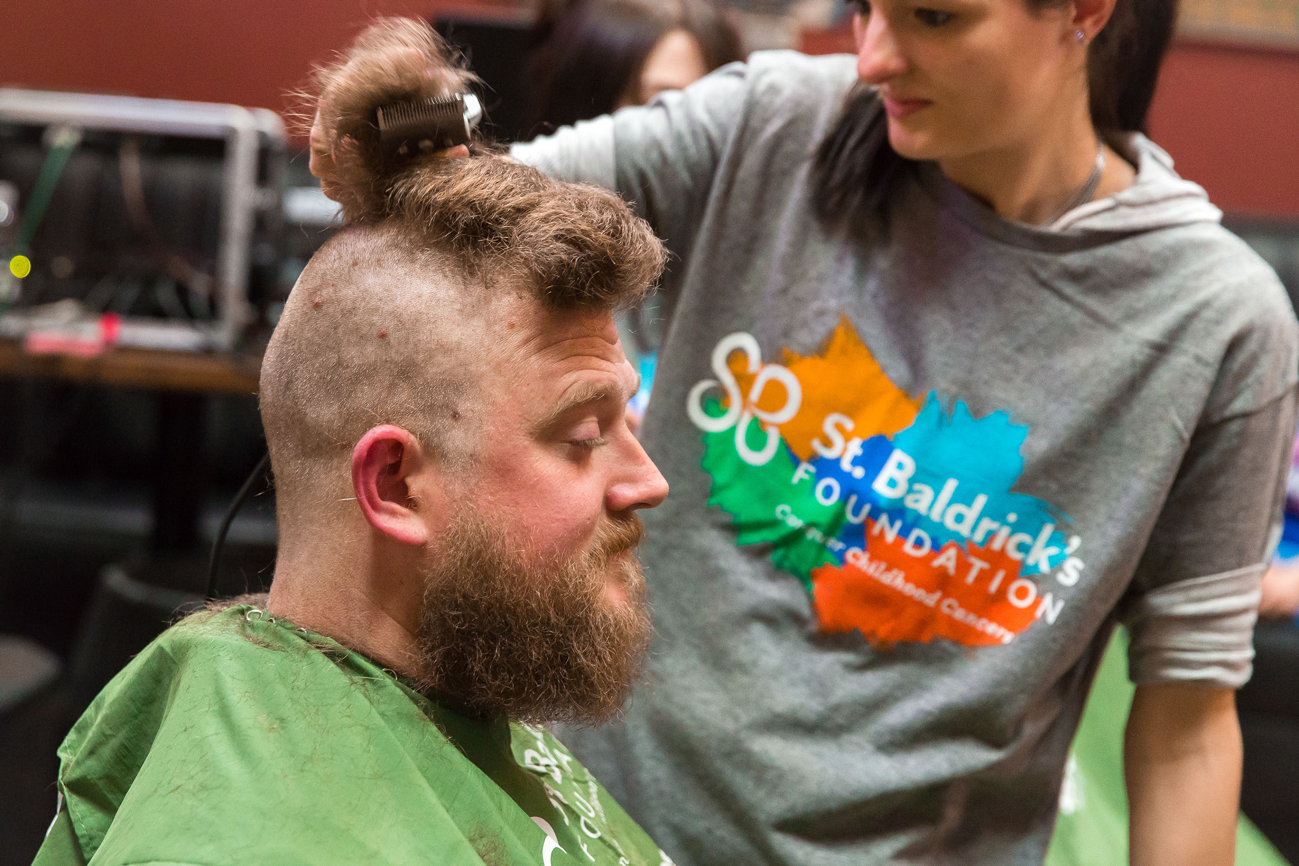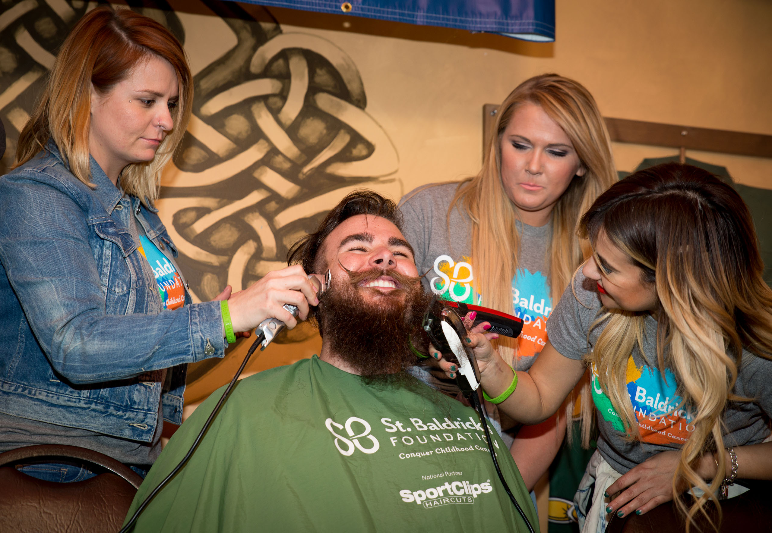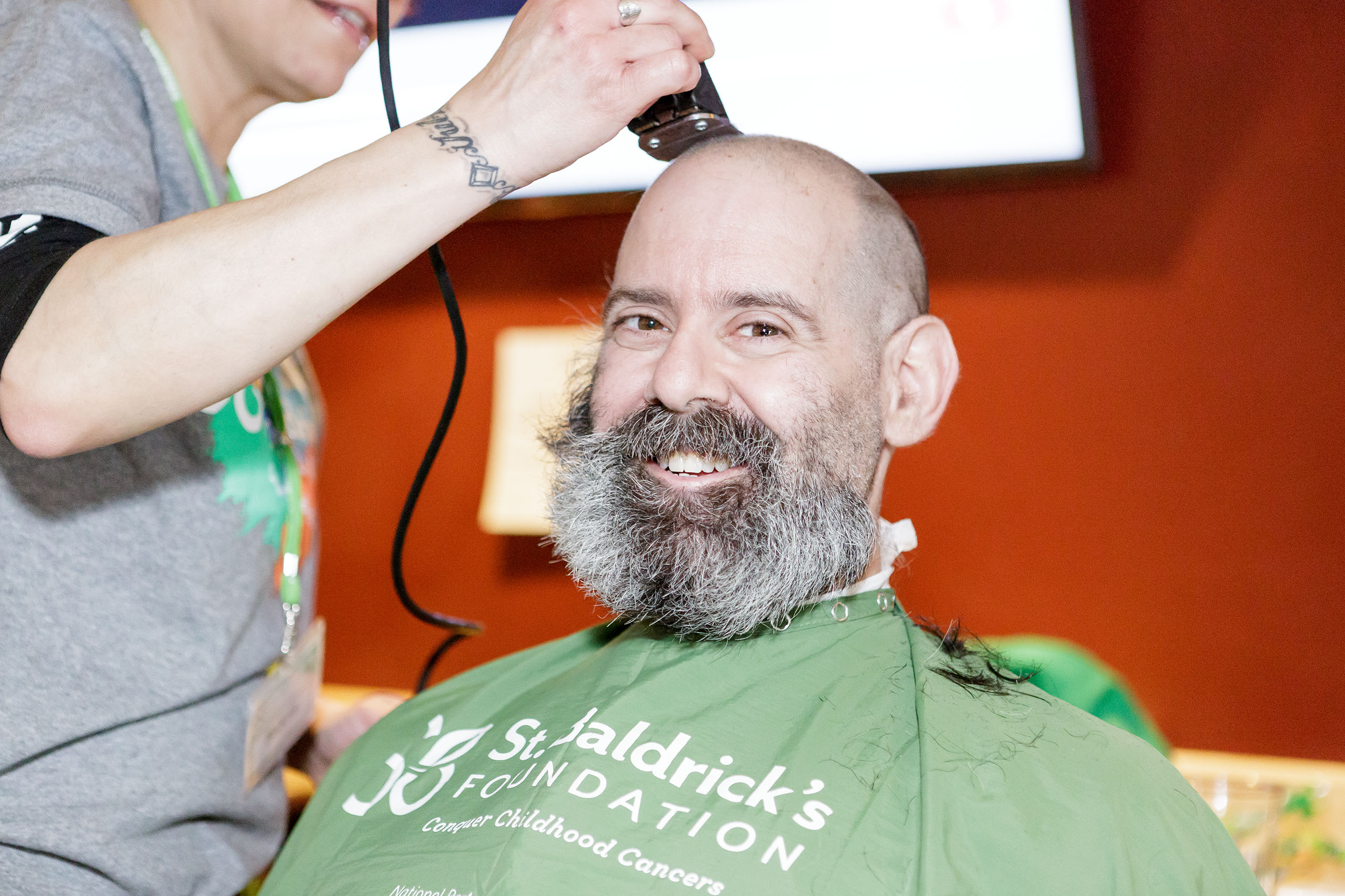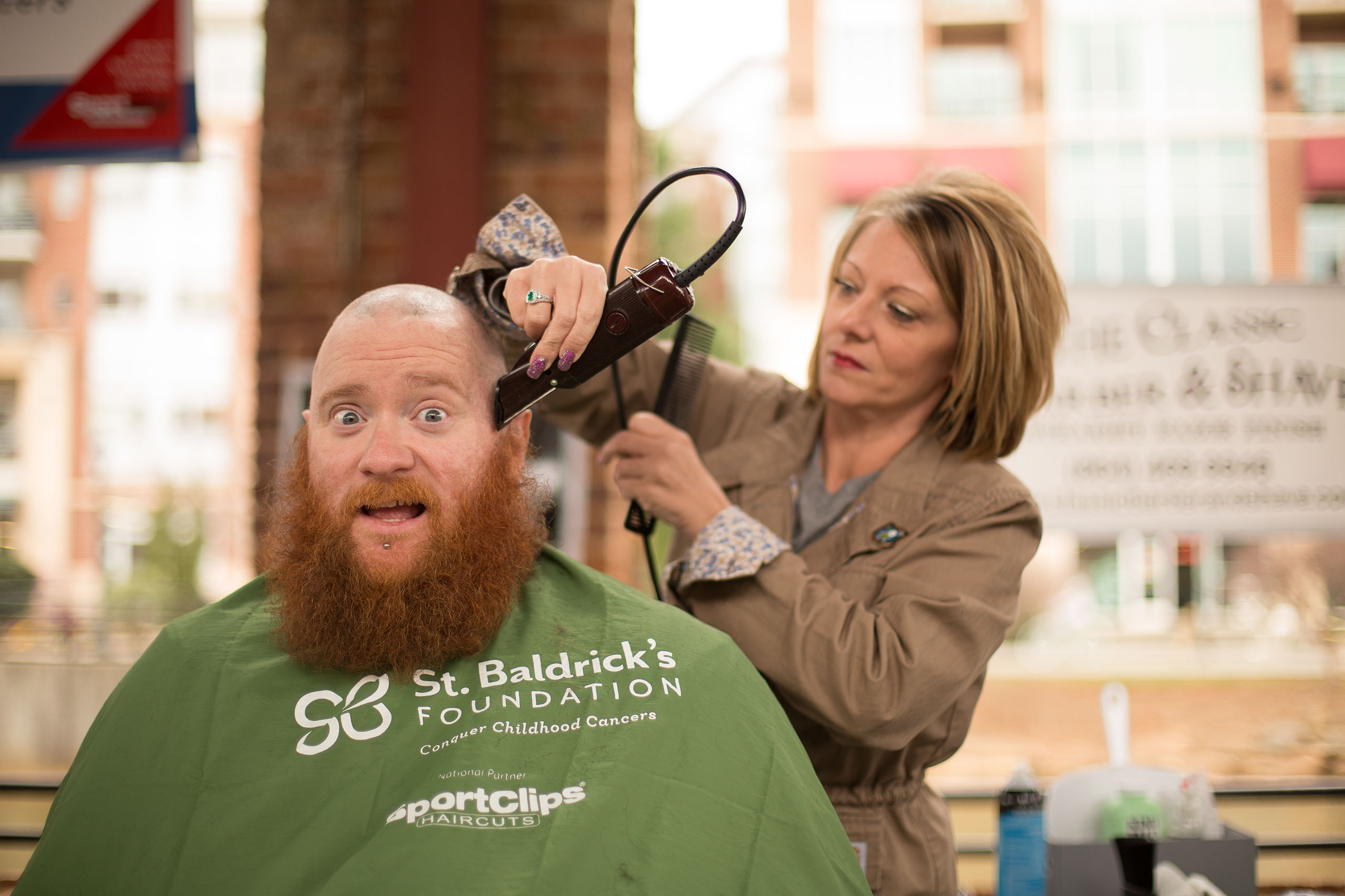 The men in the following series of photos have gallantly sacrificed their hair (but not their whiskers!) for a good cause. The St. Baldrick's Foundation is a not-for-profit organization with the aim of raising funds to help find cures for children with cancer. The name of the foundation is not associated with a recognized Saint of the Catholic Church, but is founded on word play and appropriation of the title of sainthood. Volunteers sponsored by family, friends, and employers shave their heads in solidarity with children who typically lose their hair during cancer treatment in order to raise funds.
