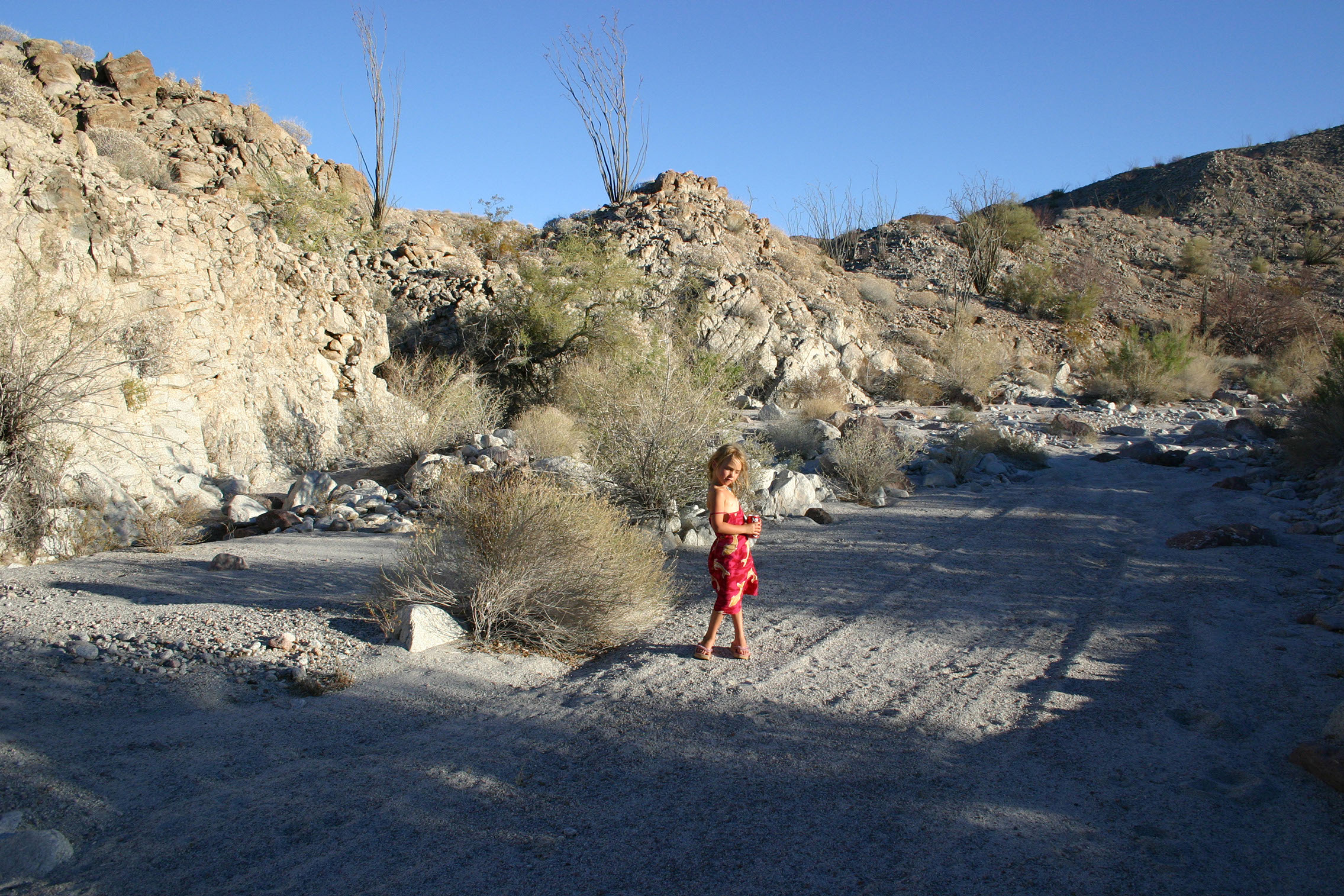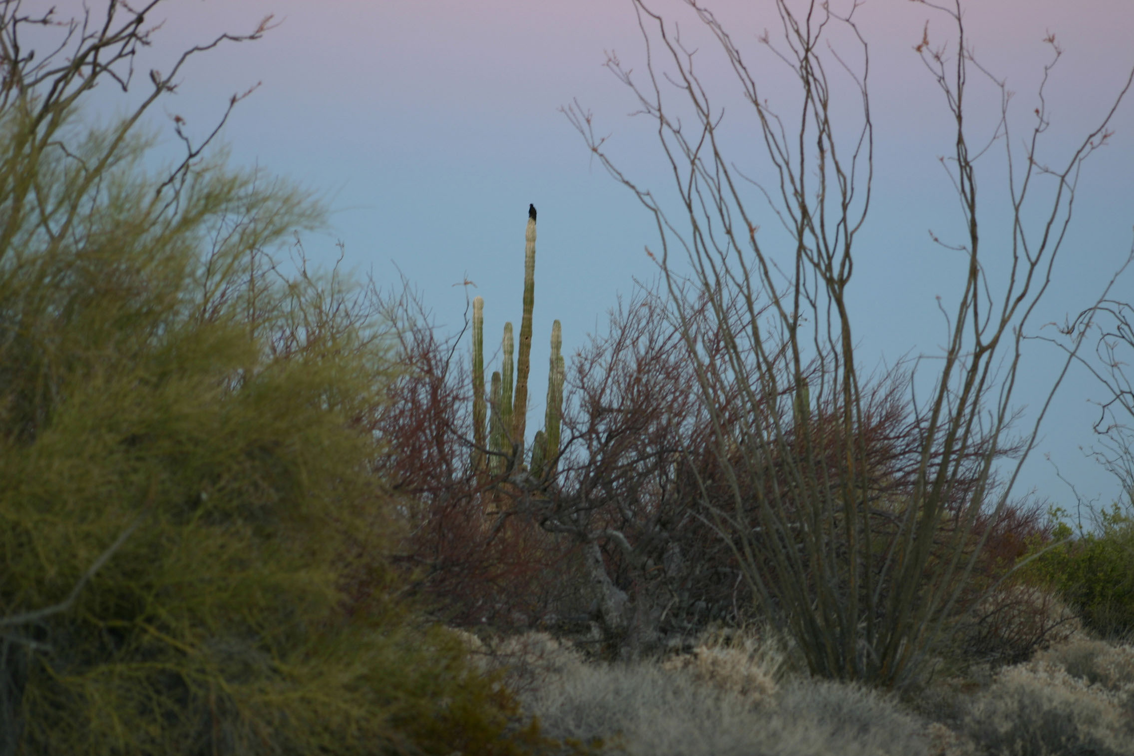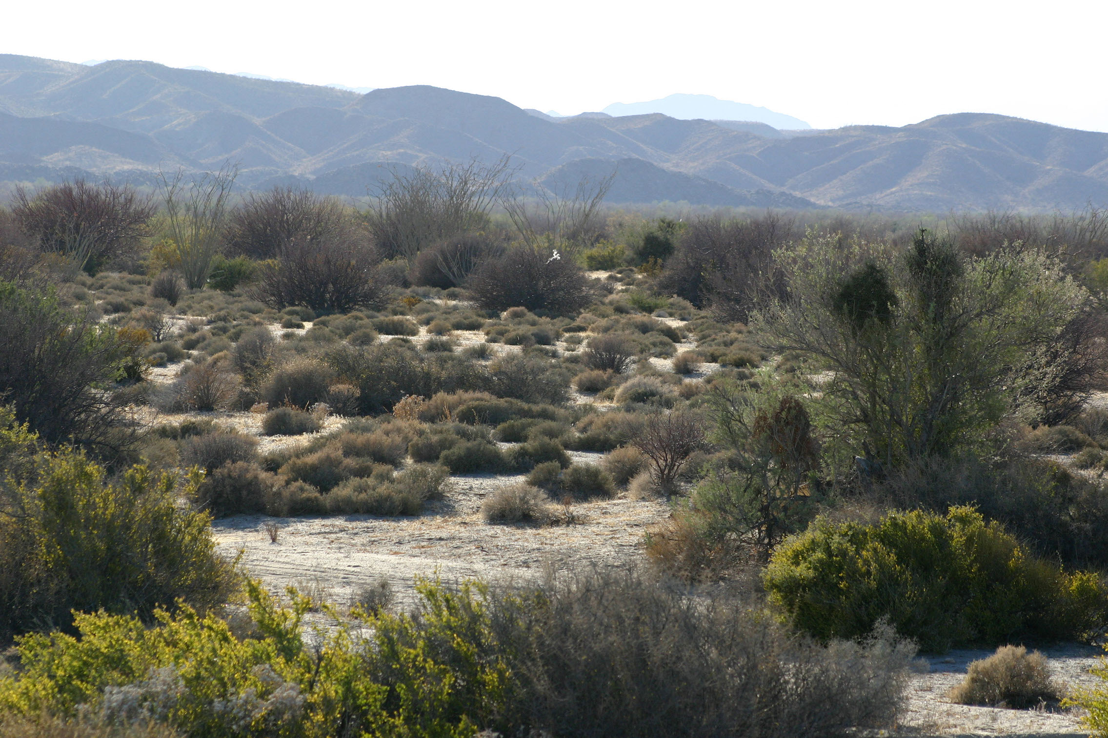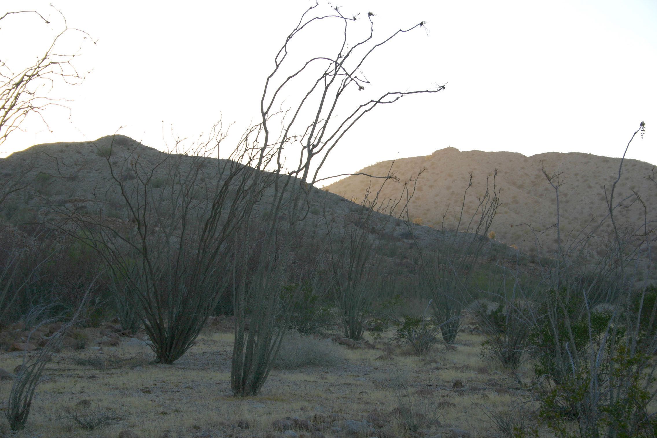 Typical desert vegetation of ocotillo and burro weed in the view West from the Cube shed, marred by wind-blown trash