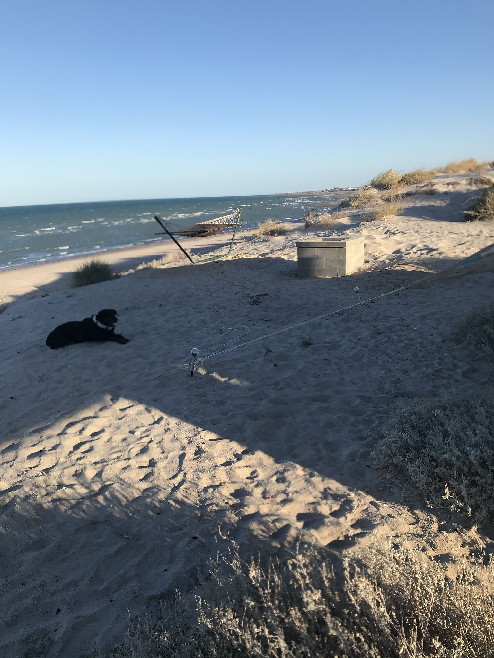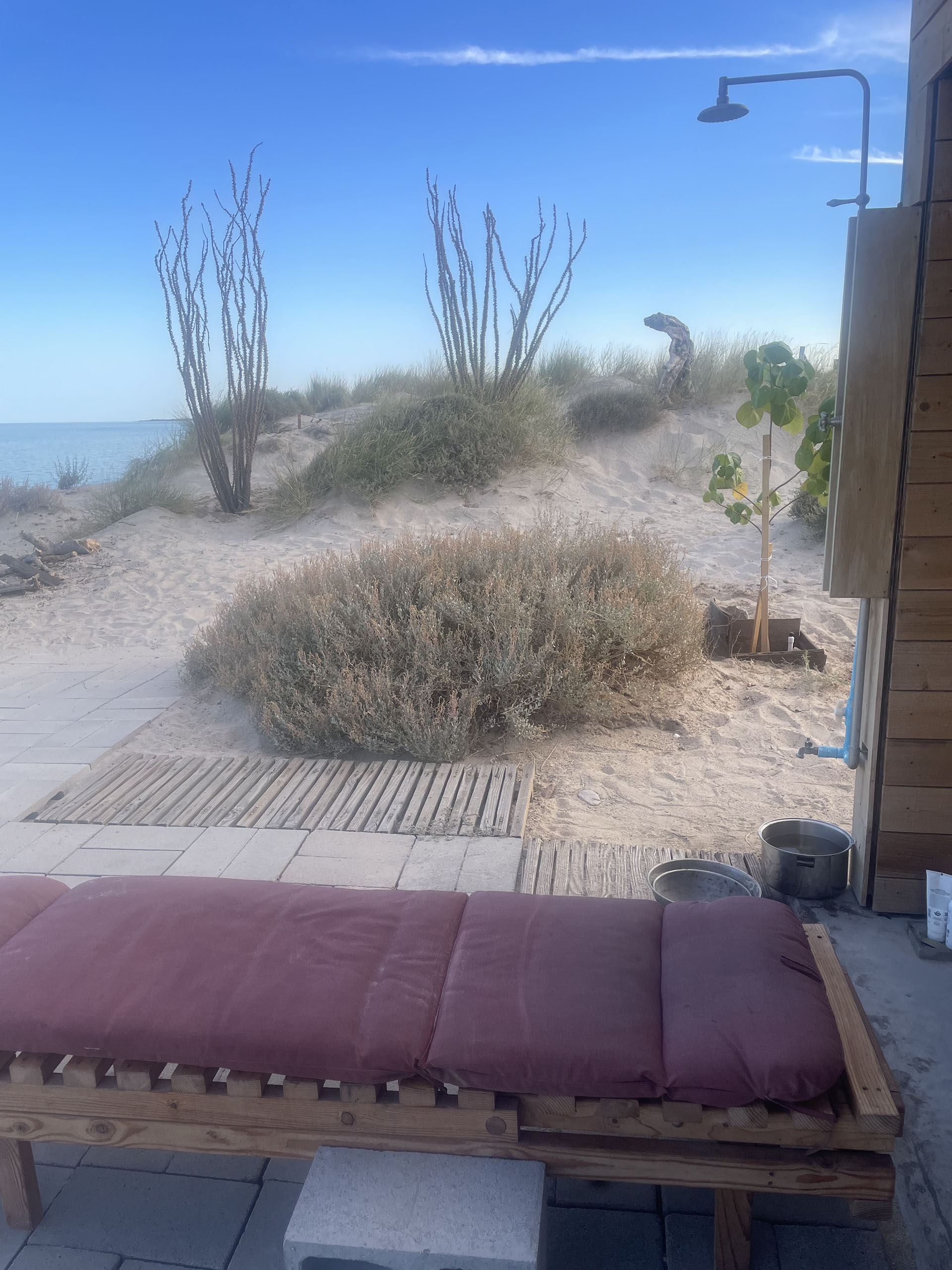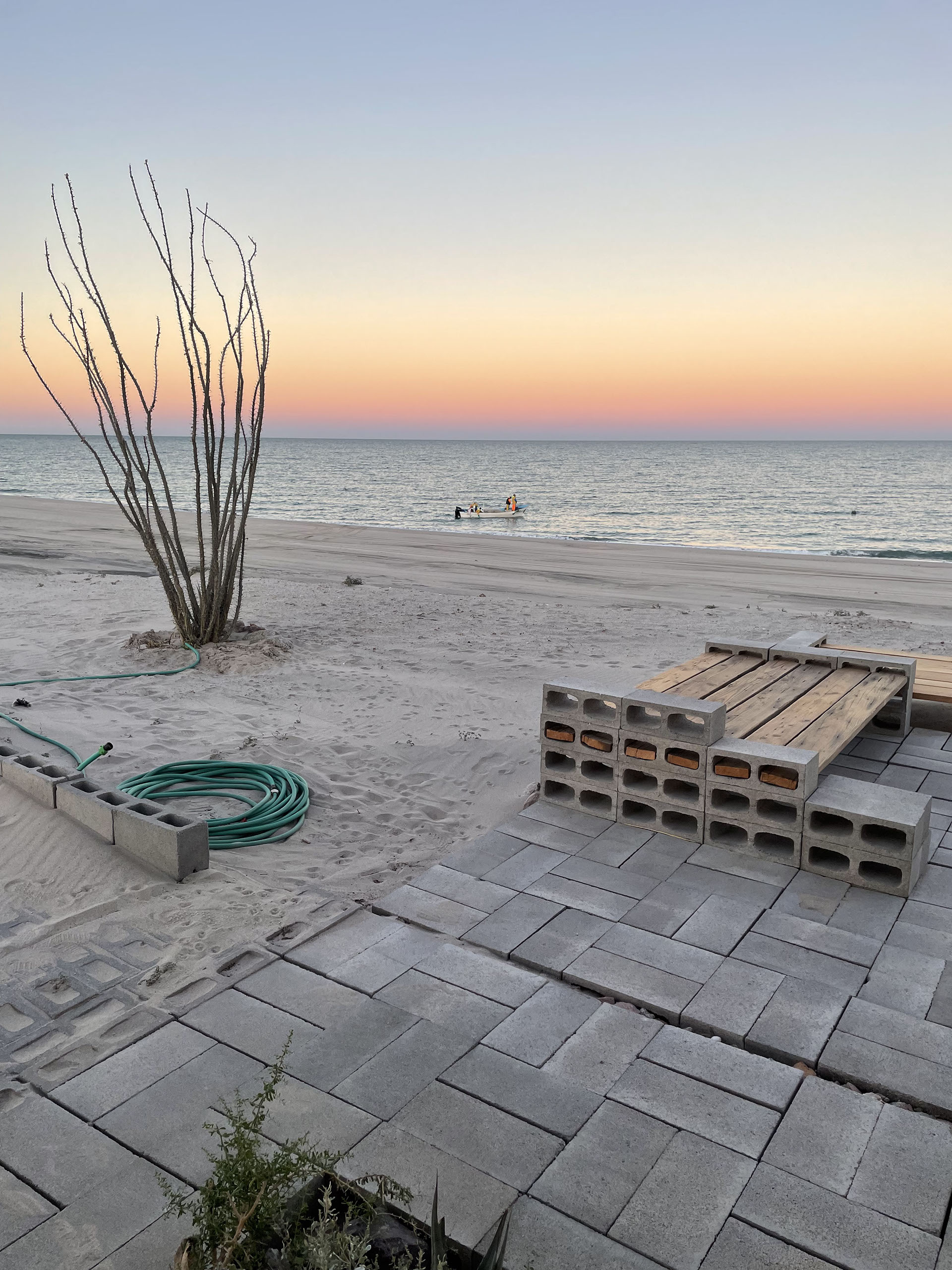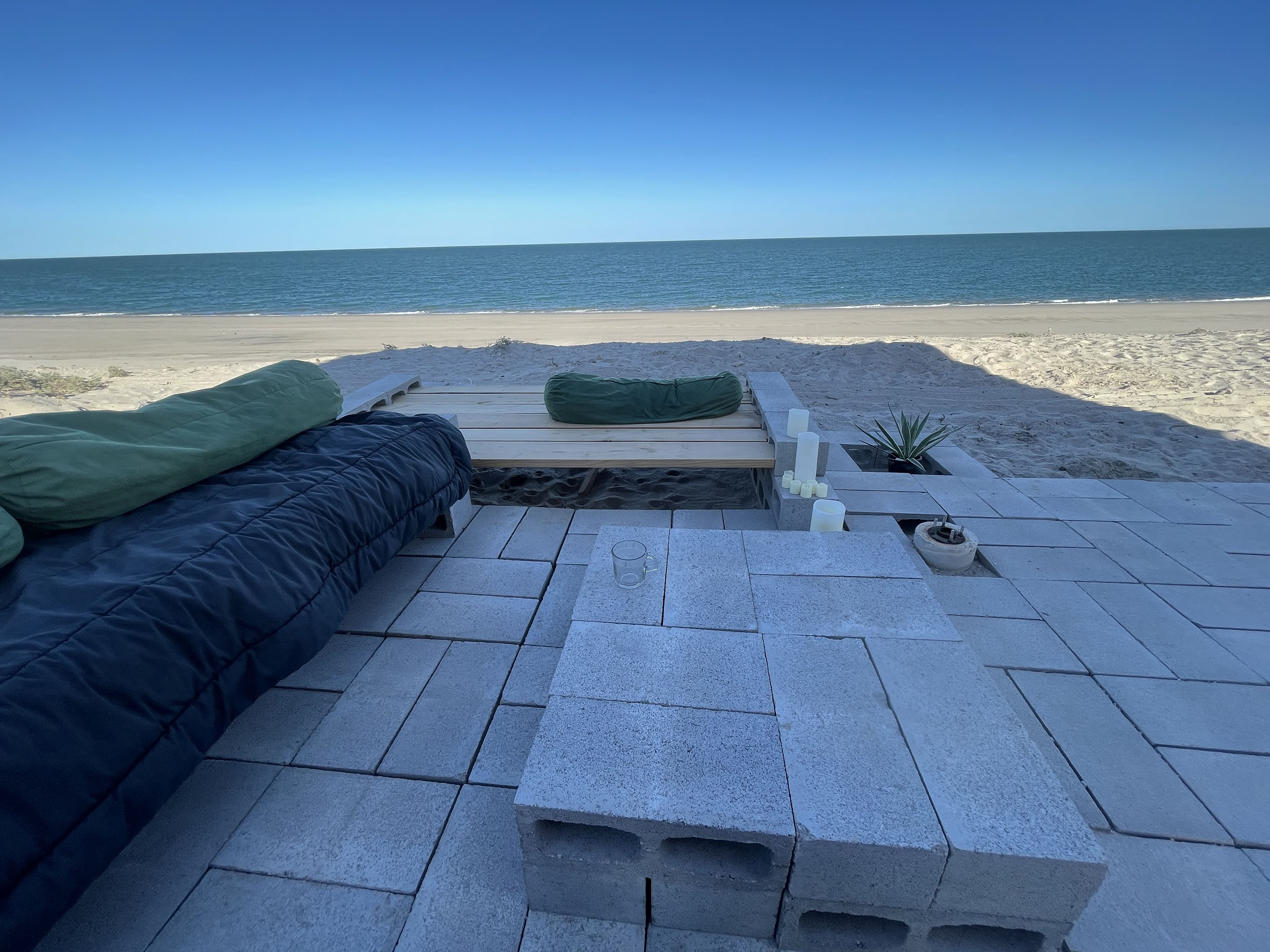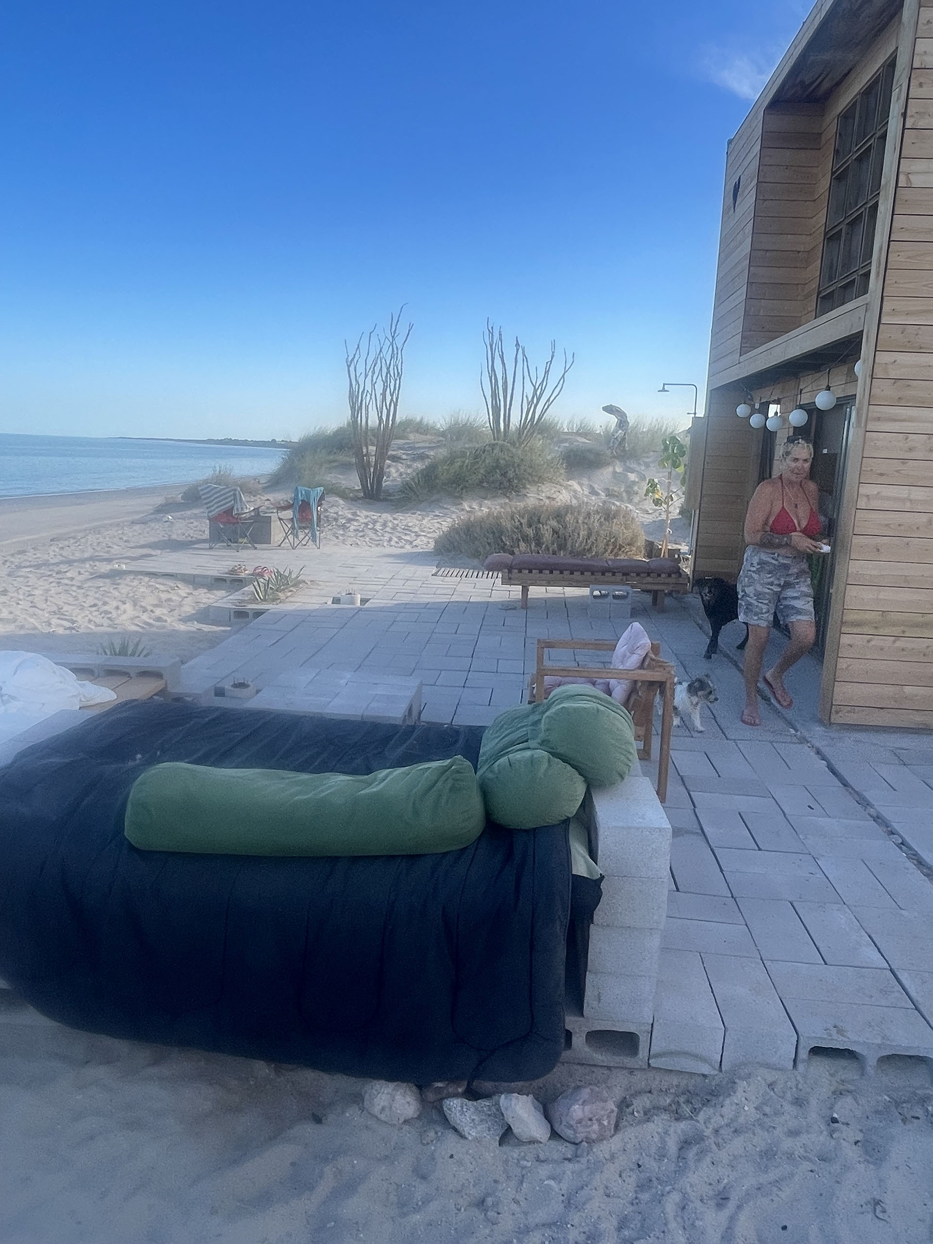 The North sleeping benches at sunset In the background a panga sets out for fishing