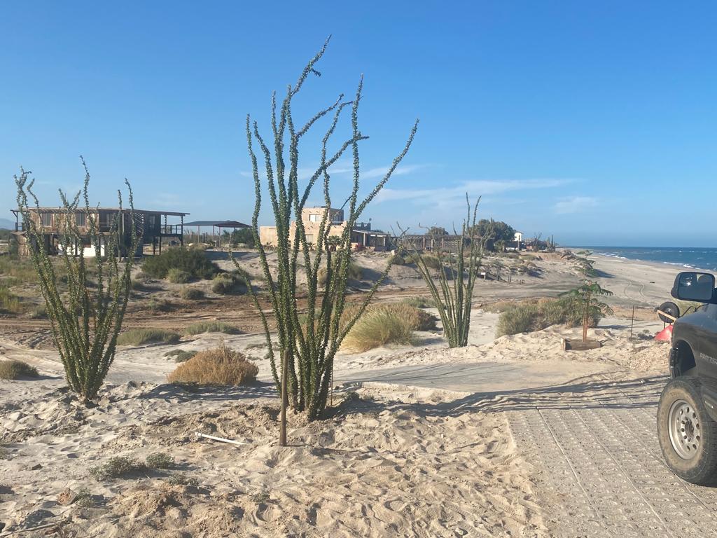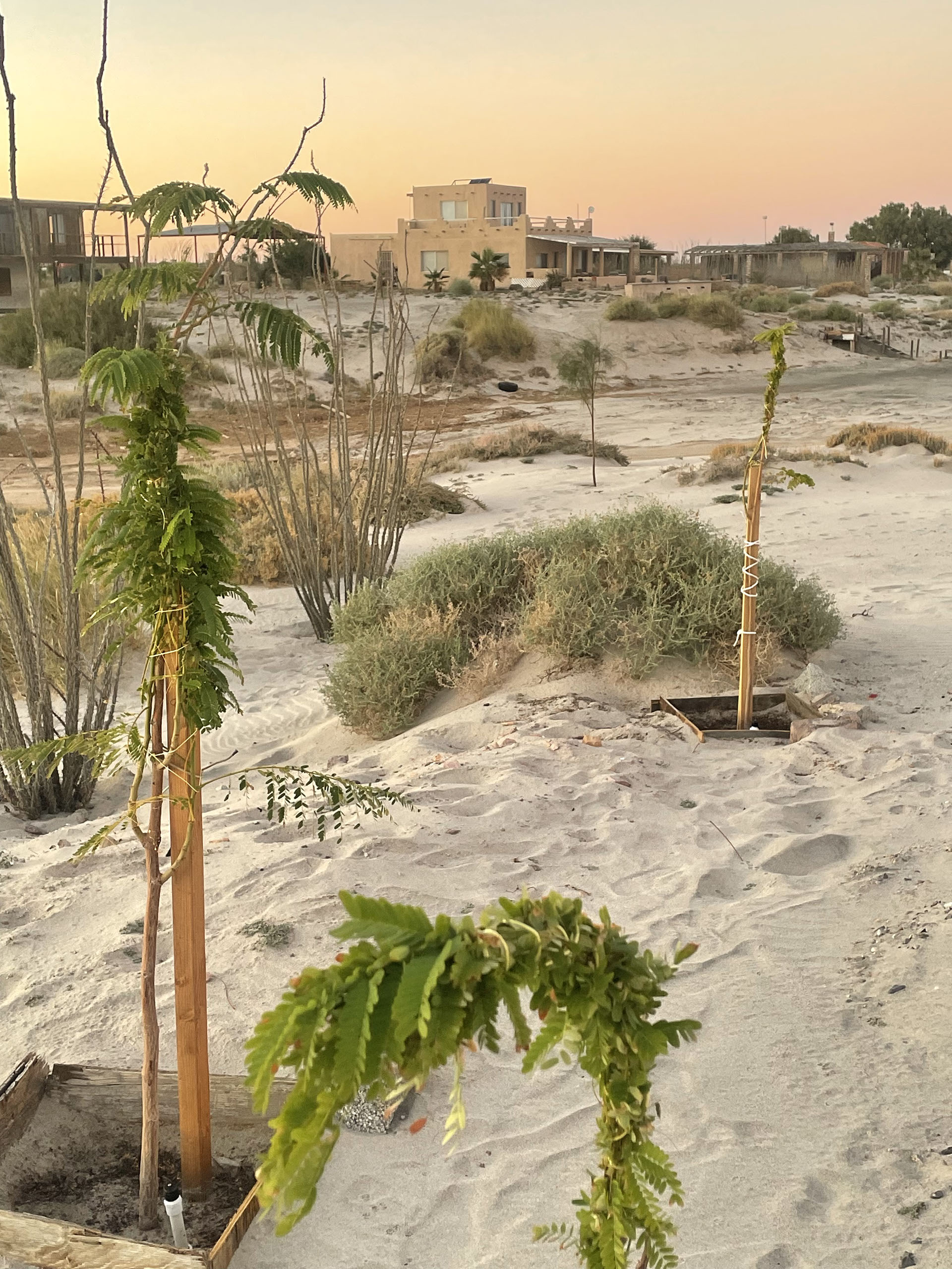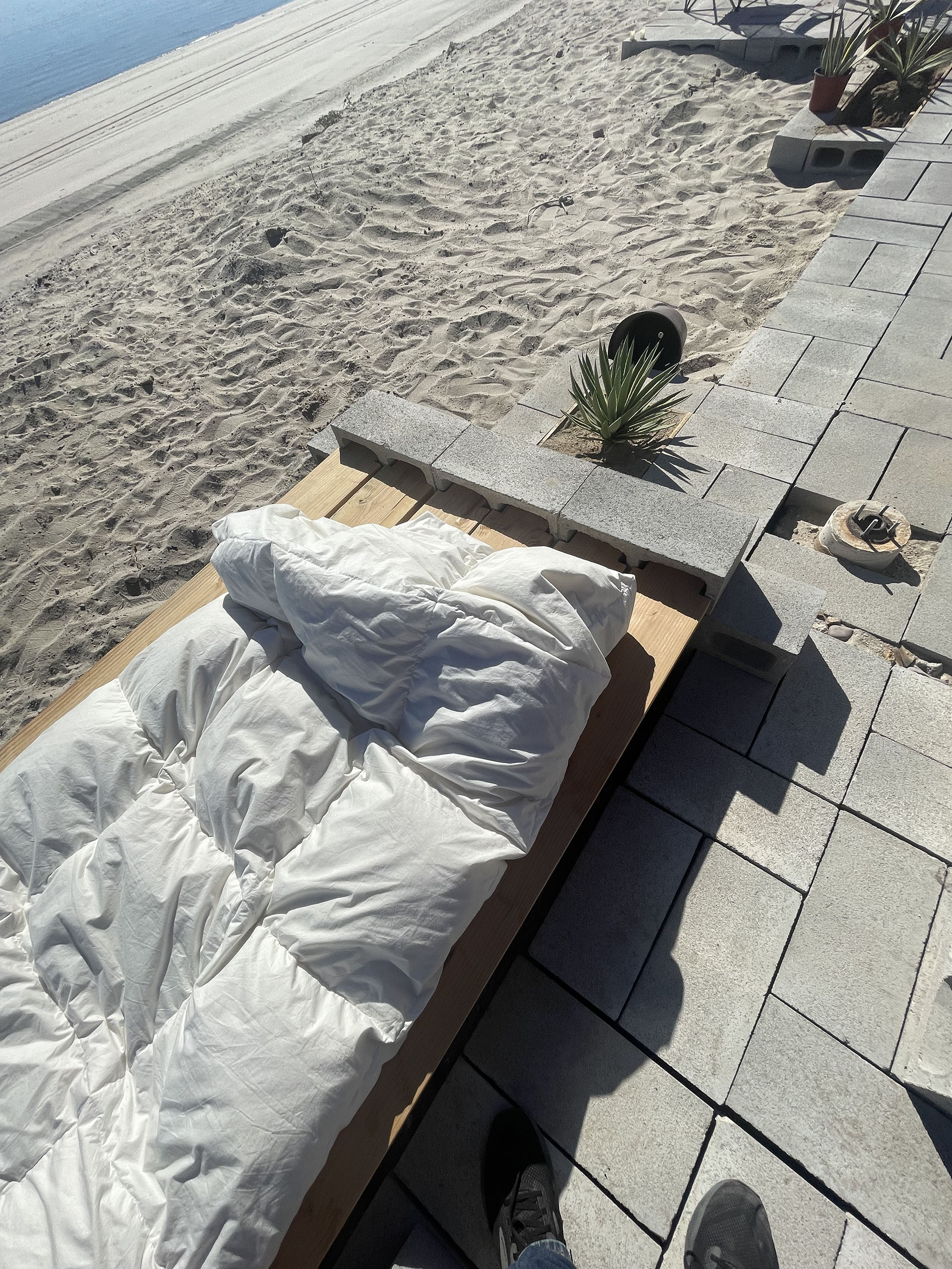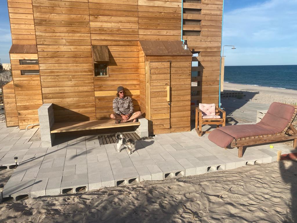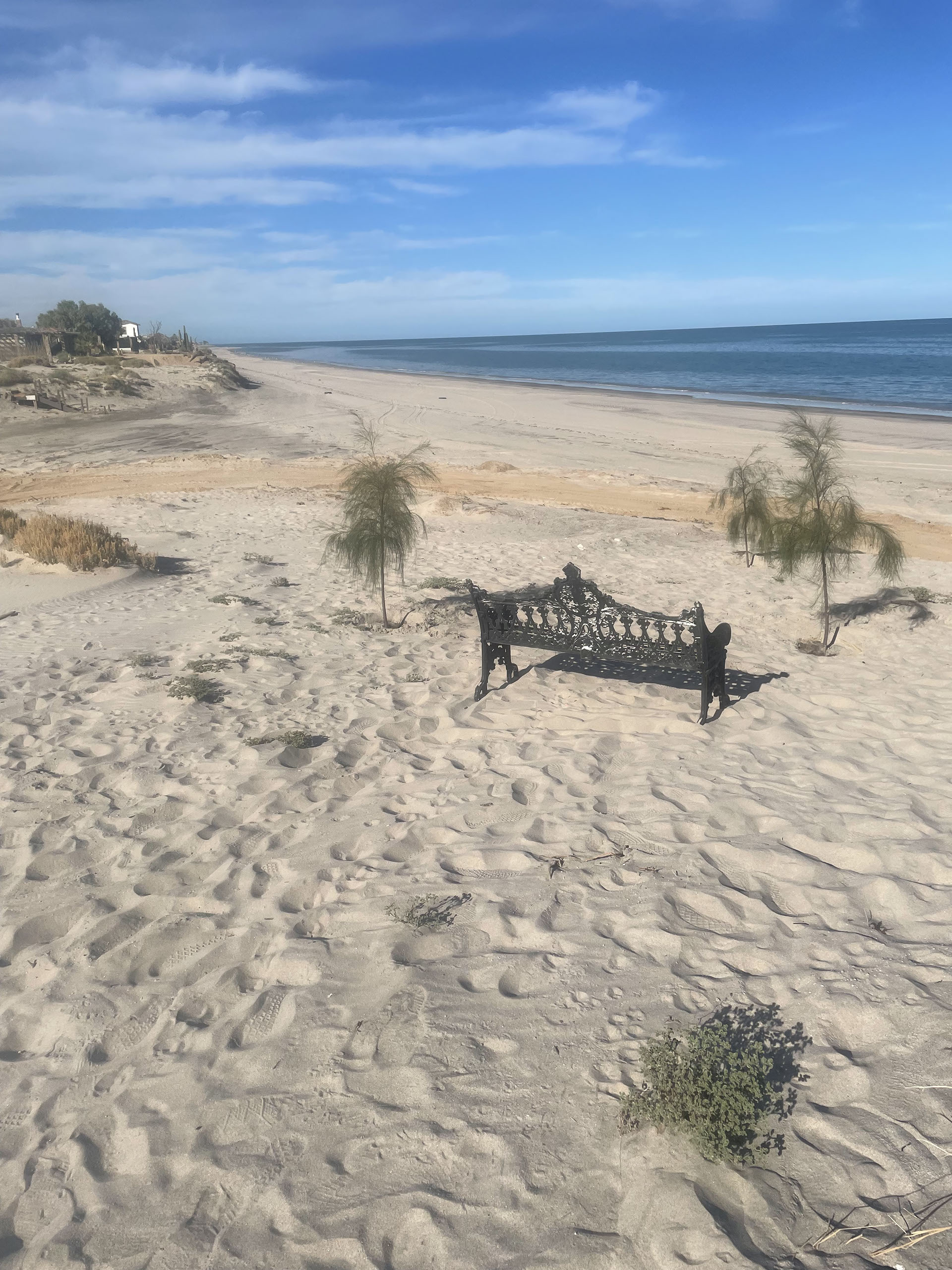 The North sleeping benches at sunset In the background a panga sets out for fishing