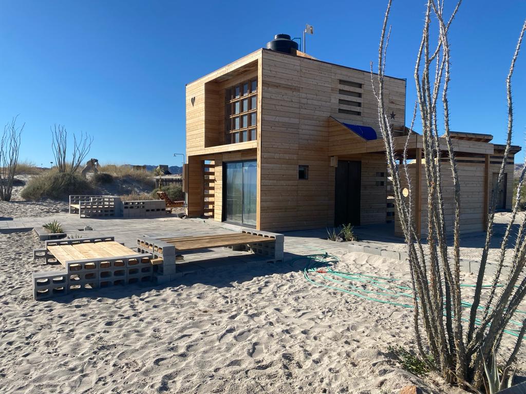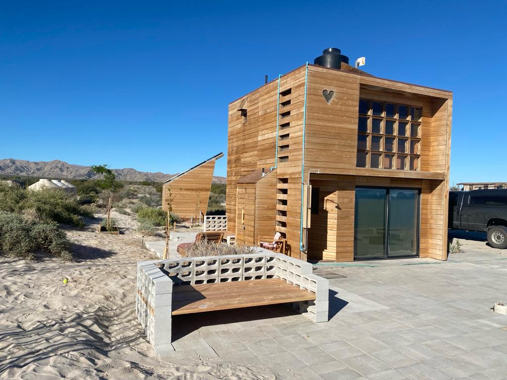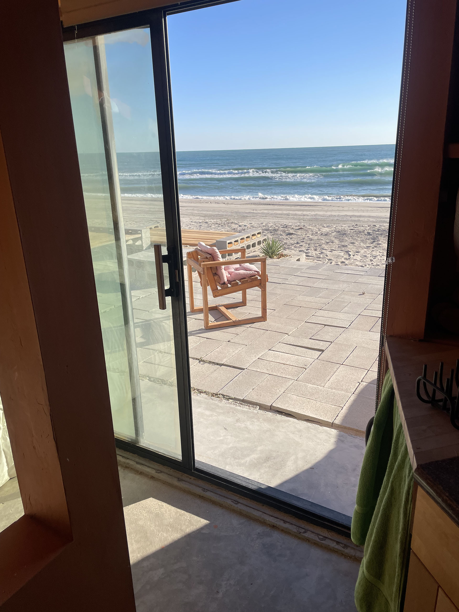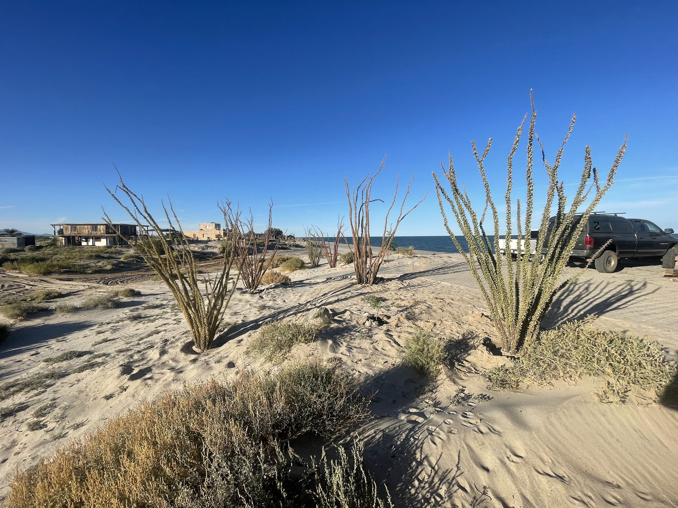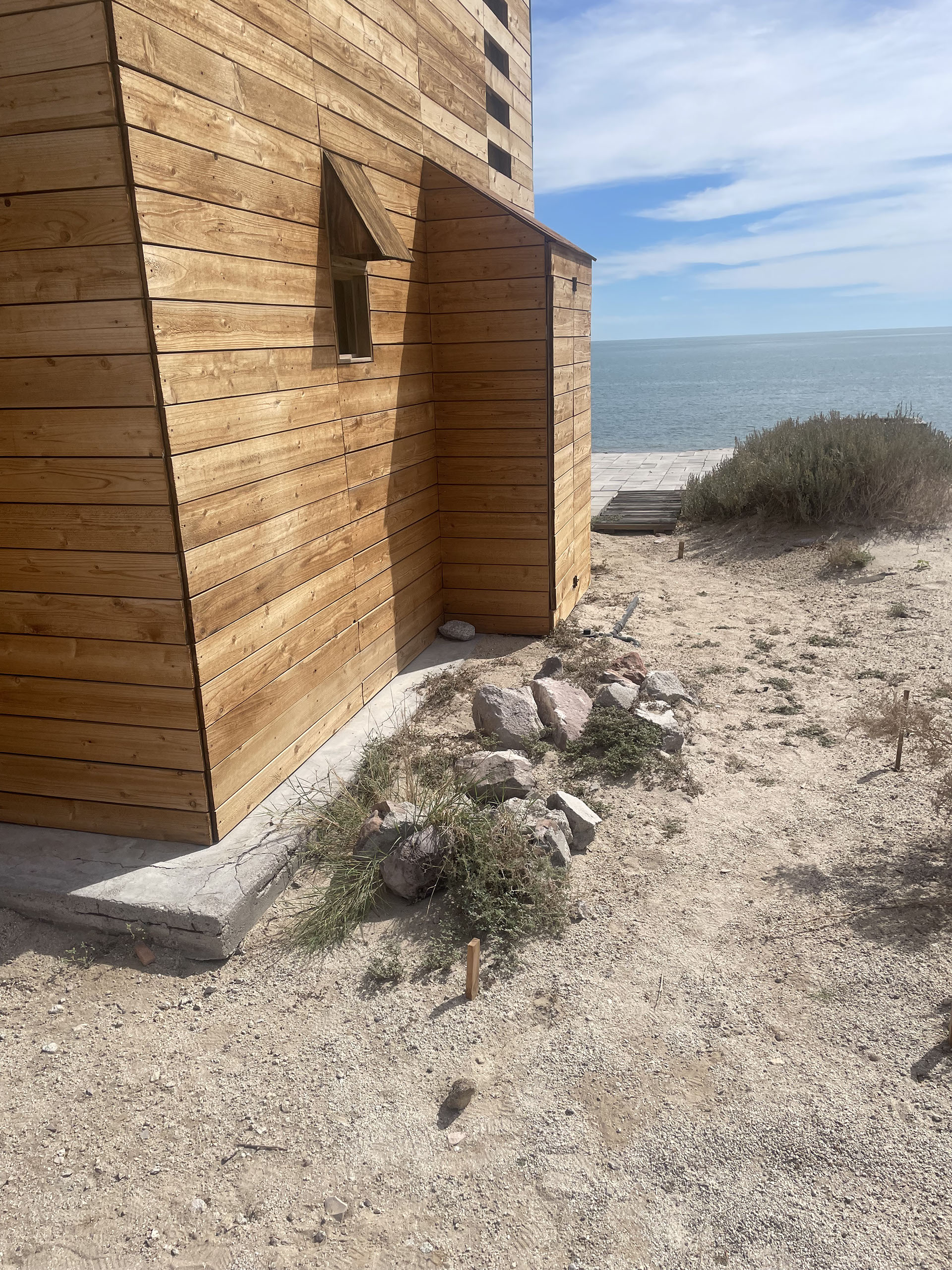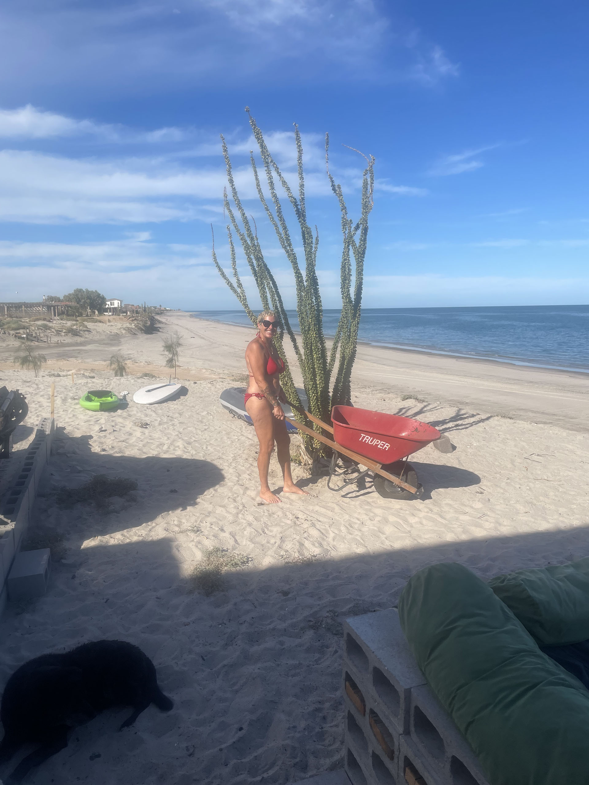 The North sleeping benches at sunset In the background a panga sets out for fishing