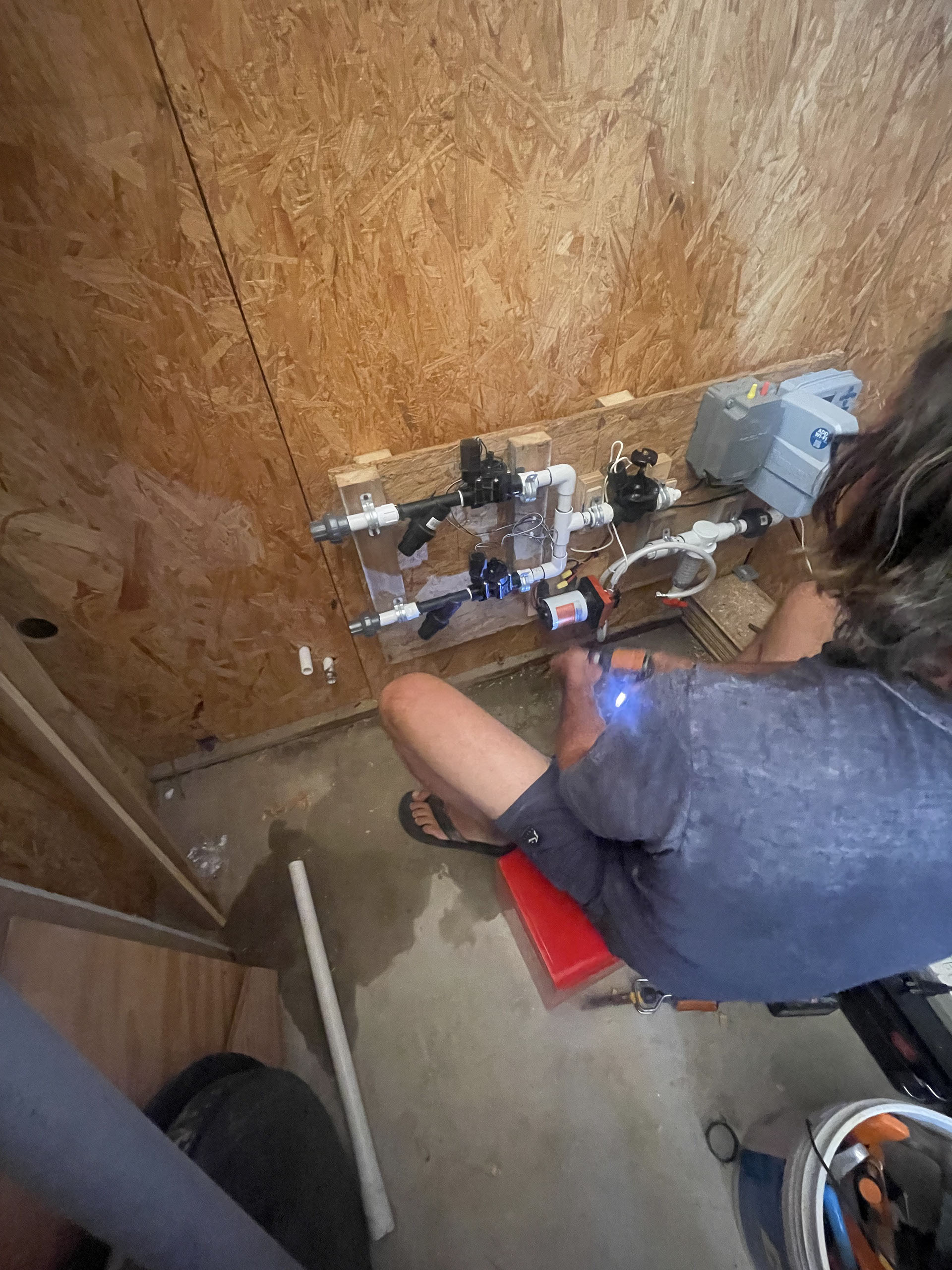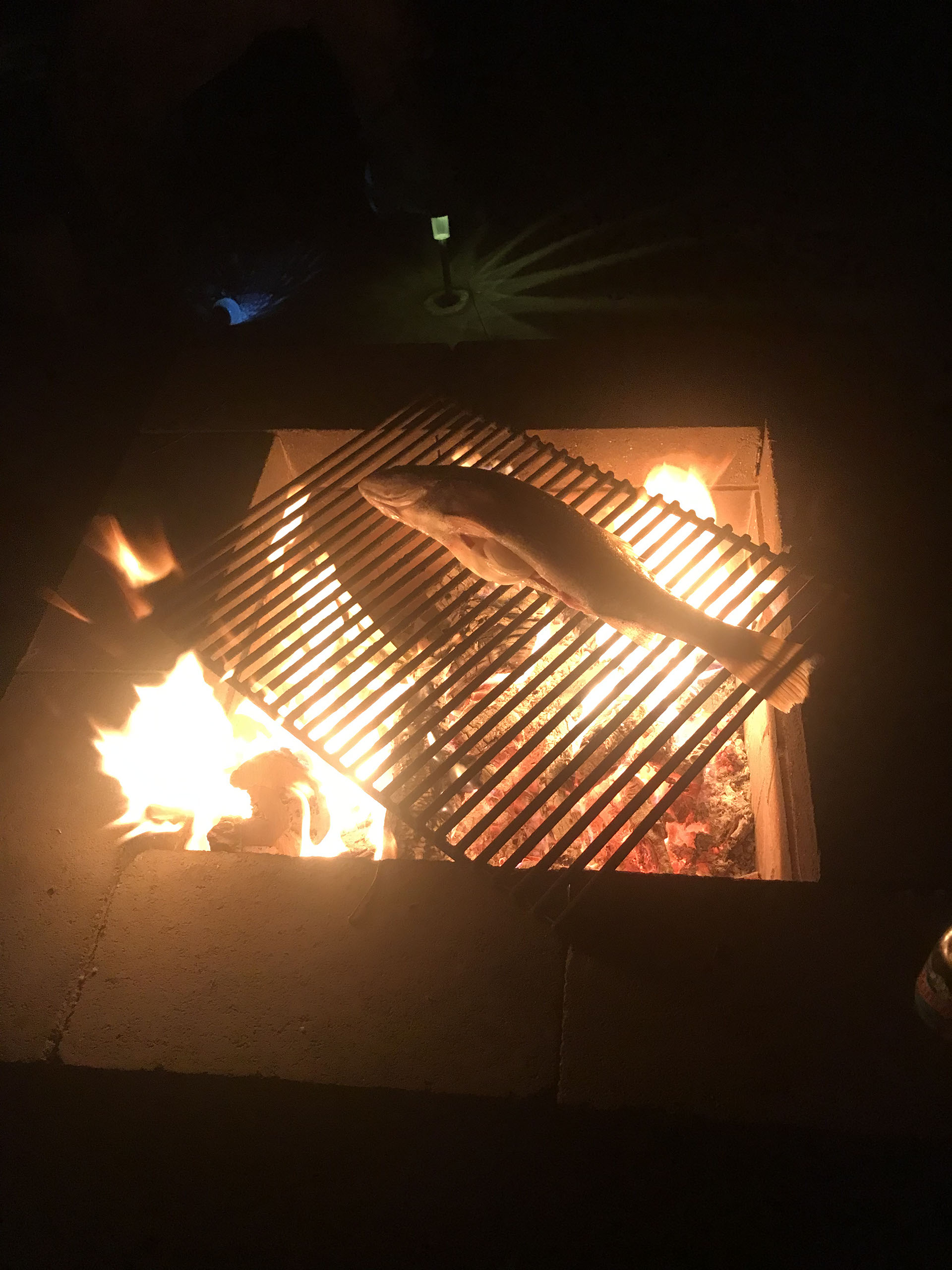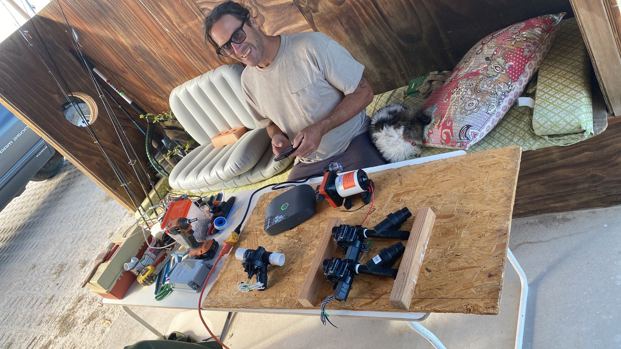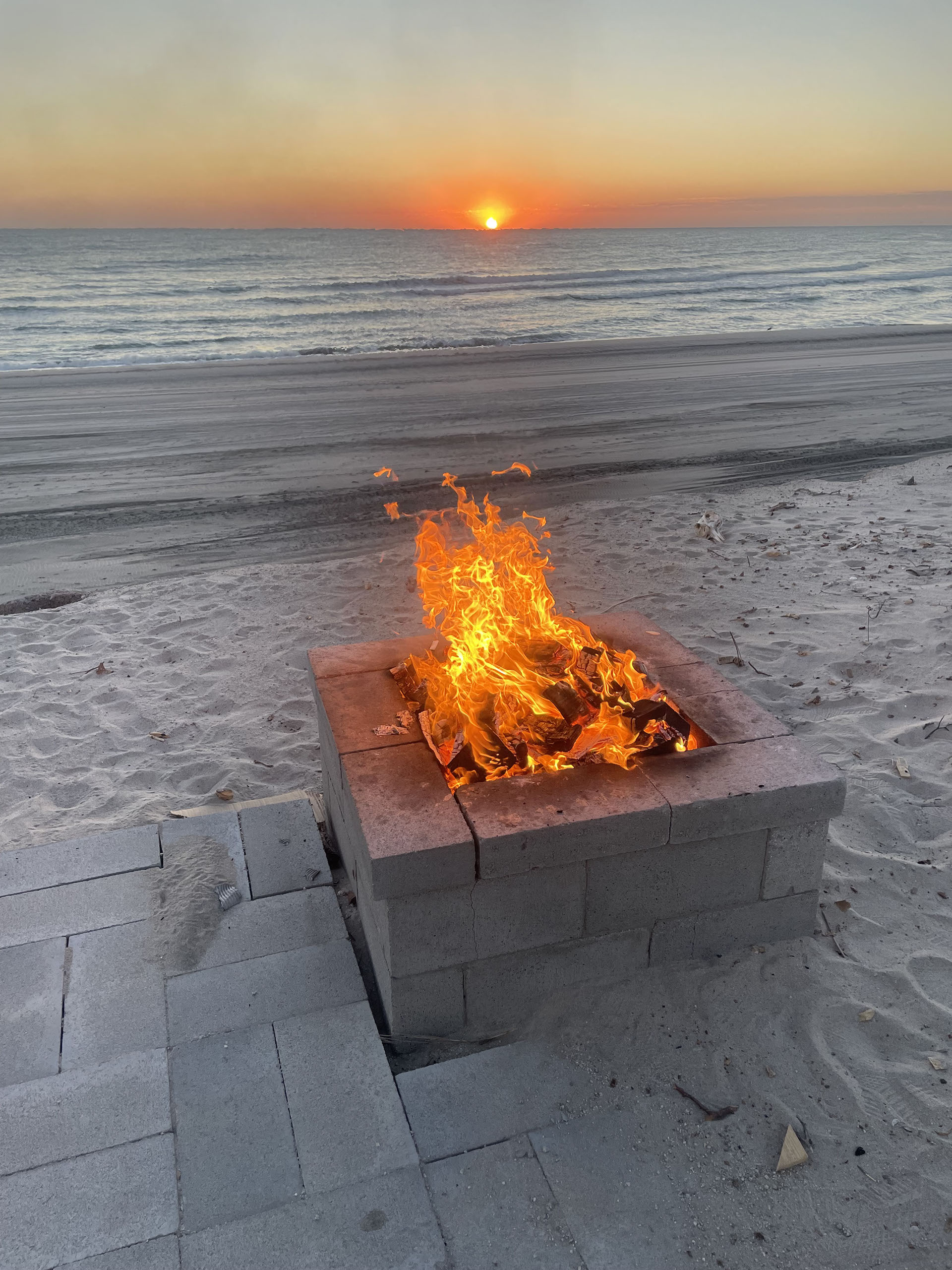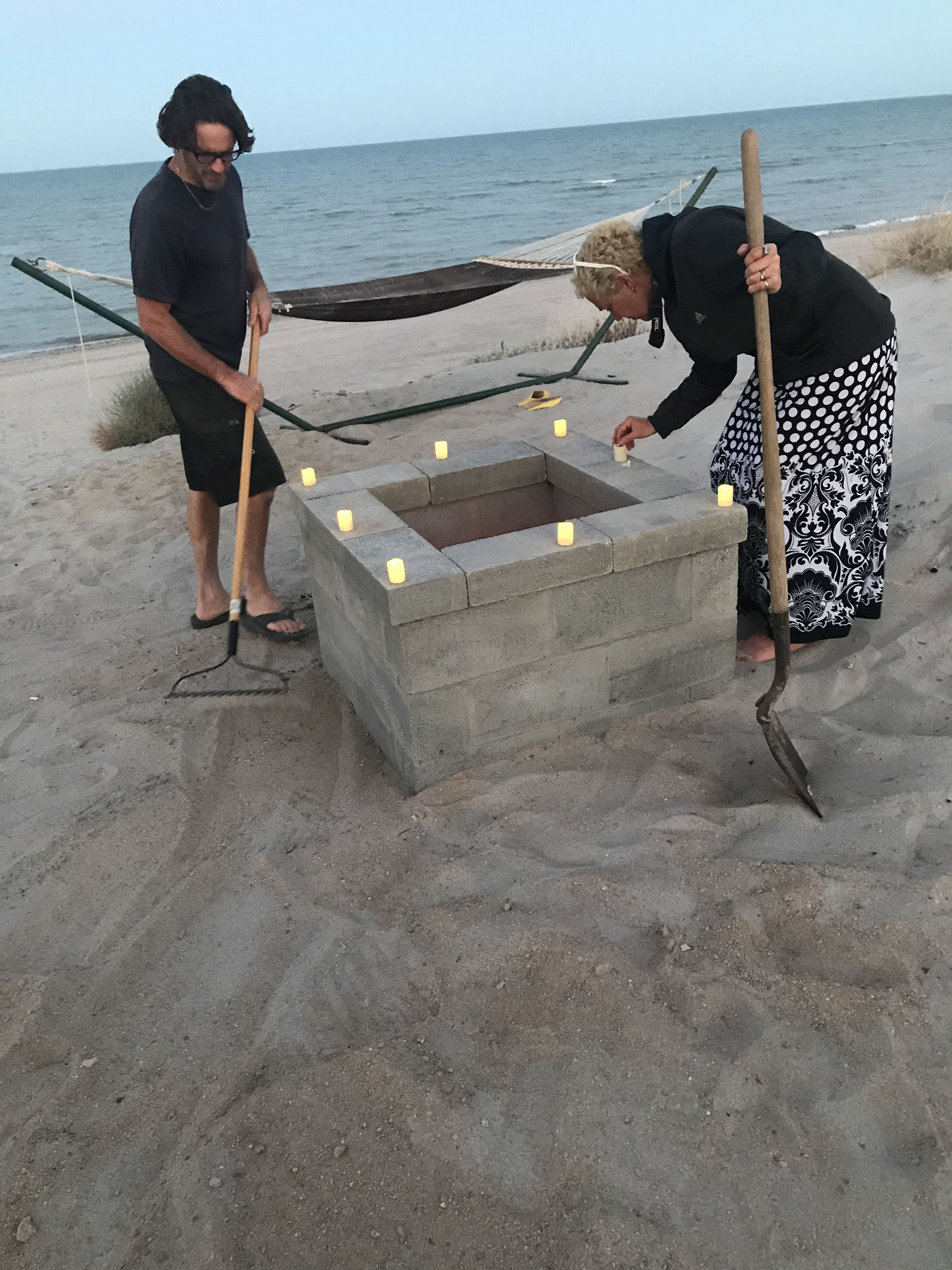 Tess and Dan celebrate the completion of the firepit with electric candles