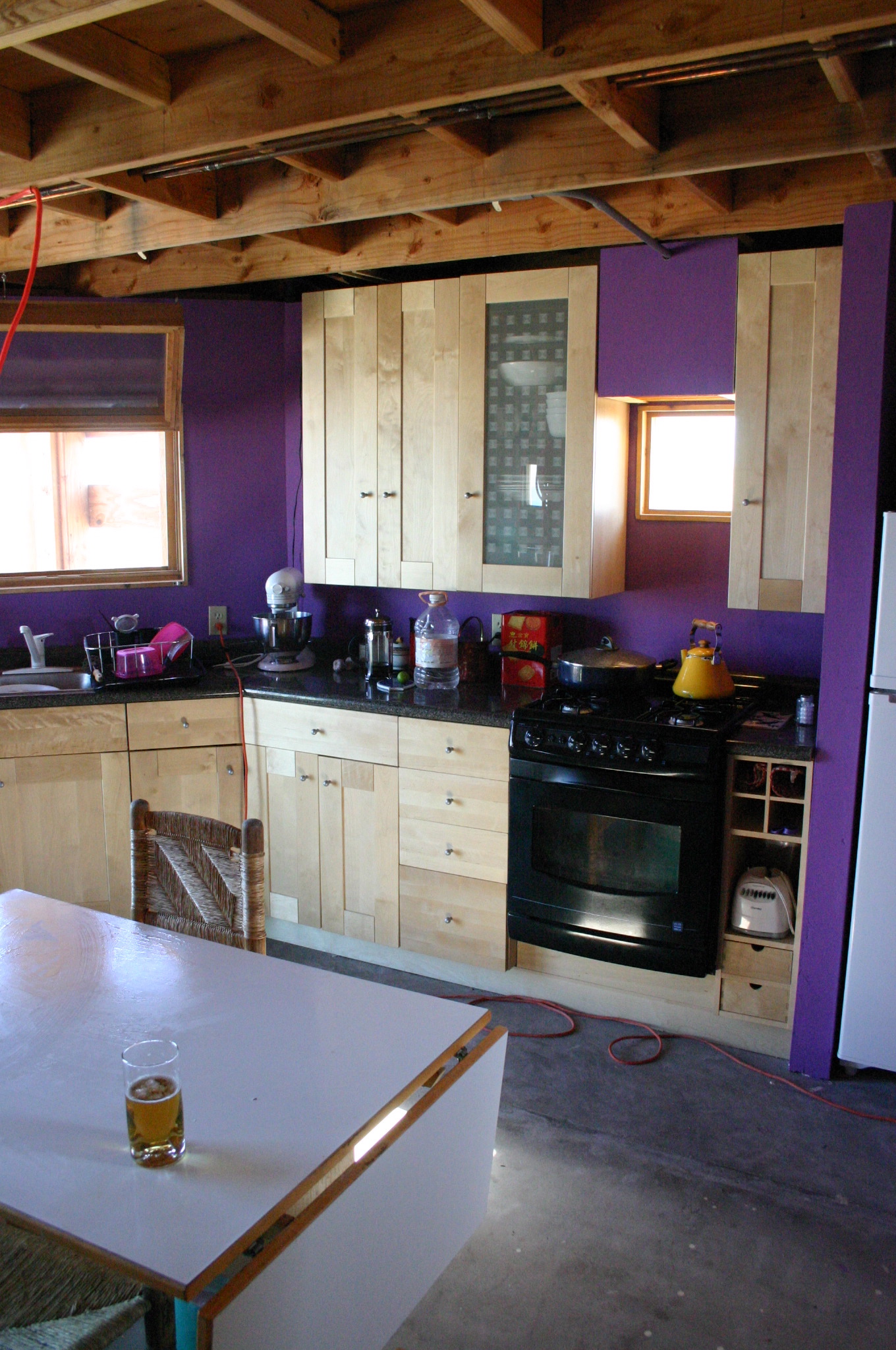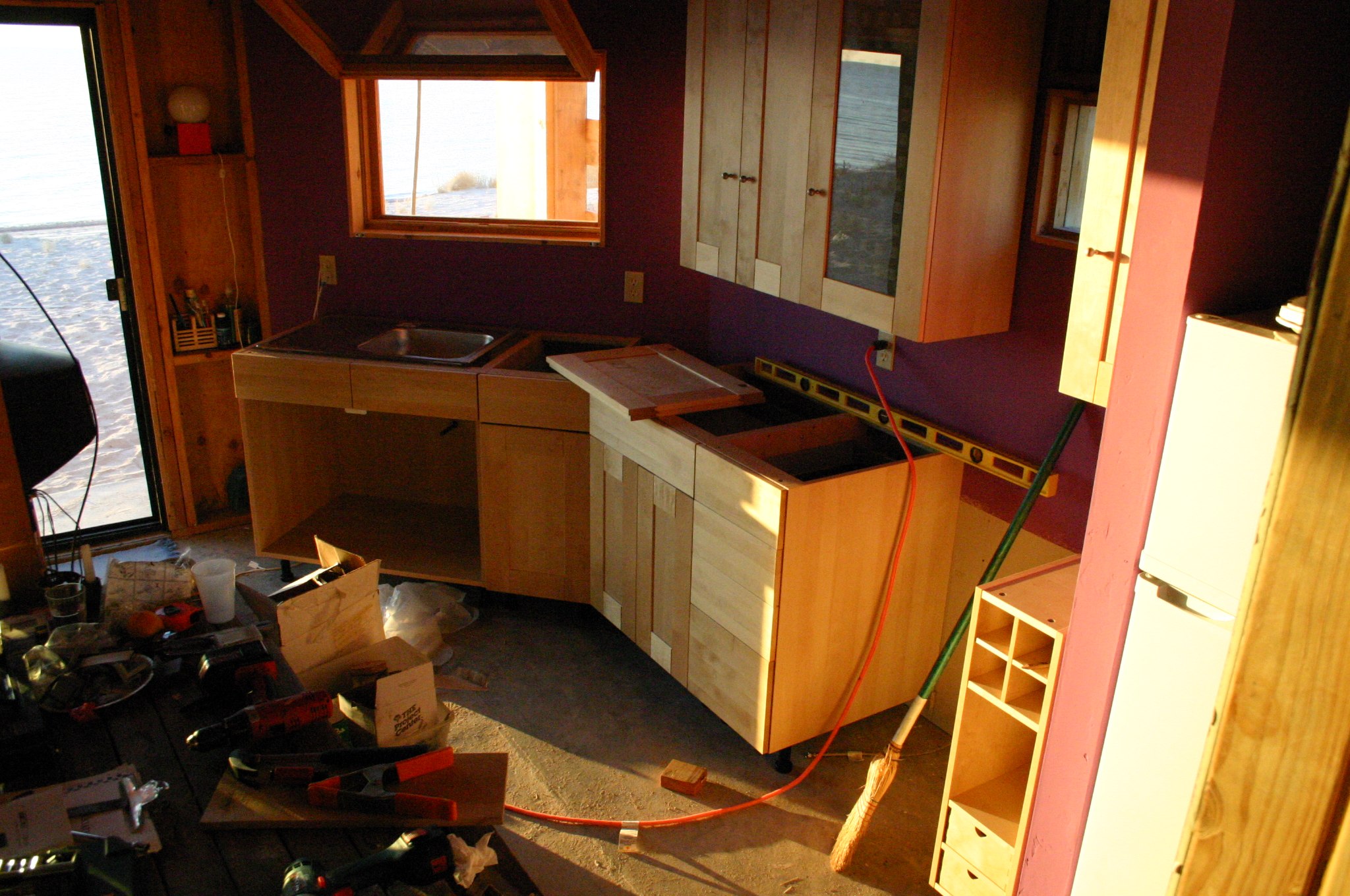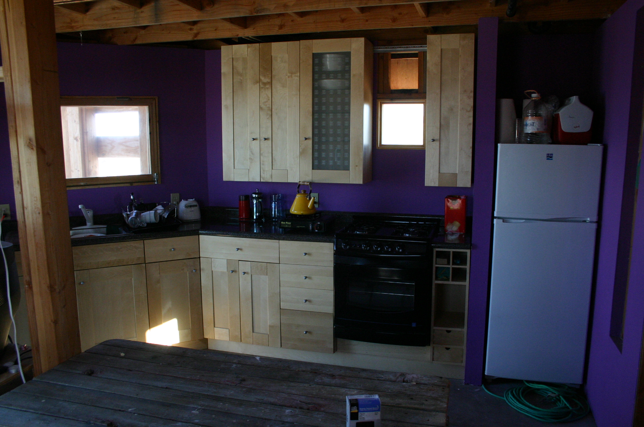 The lower walls are left unpainted since the will be covered by cabinets, meanwhile the upper cabinets are assembled and hung