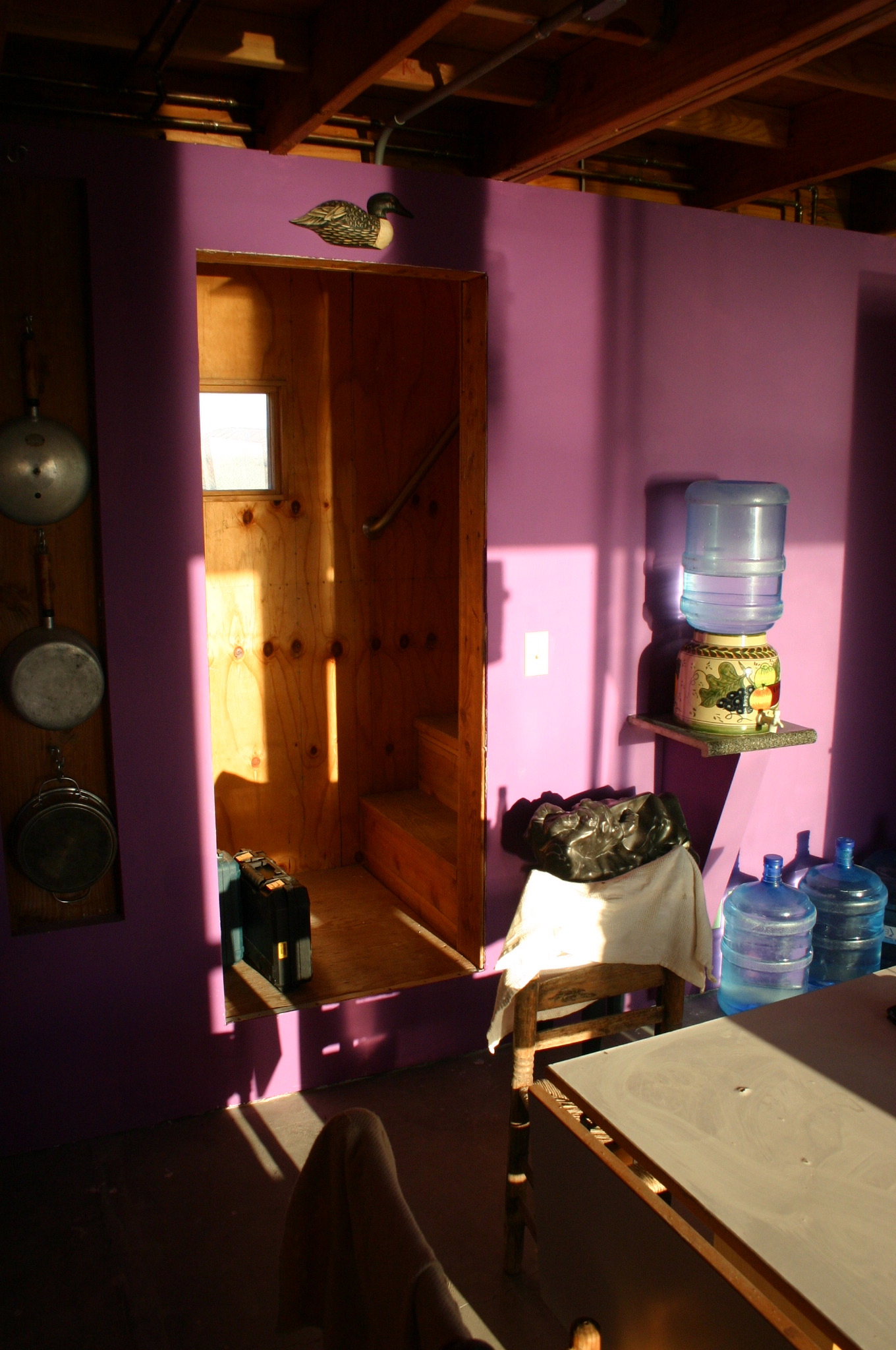 The final paint job in the water-cooler area. The wooden duck is a rebus to remind visitors over six feet tall to bow their heads before entering the stairwell