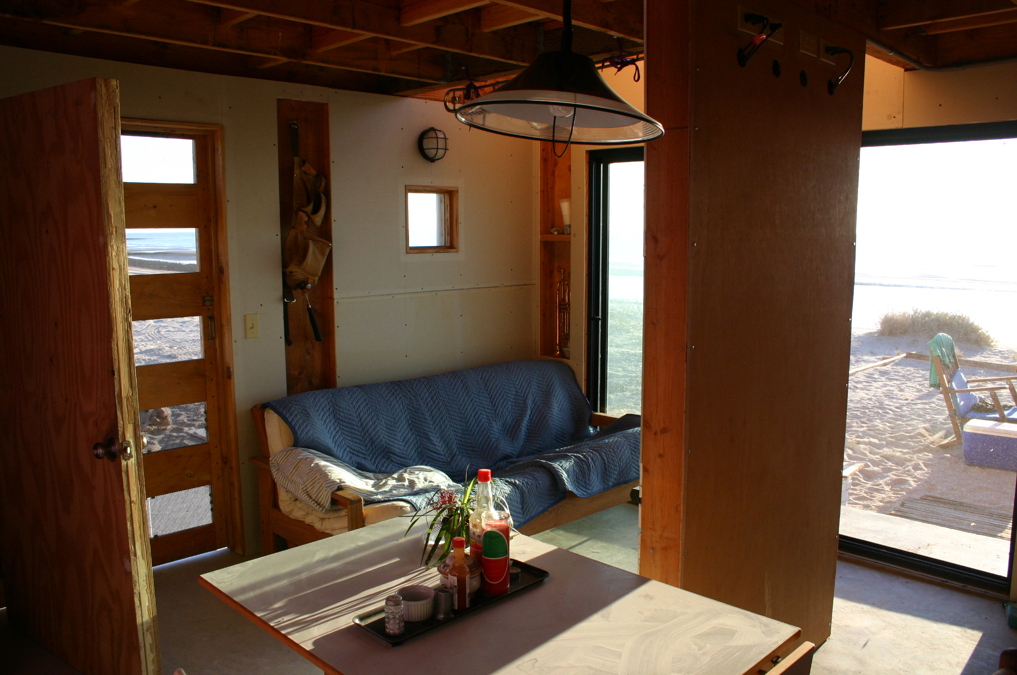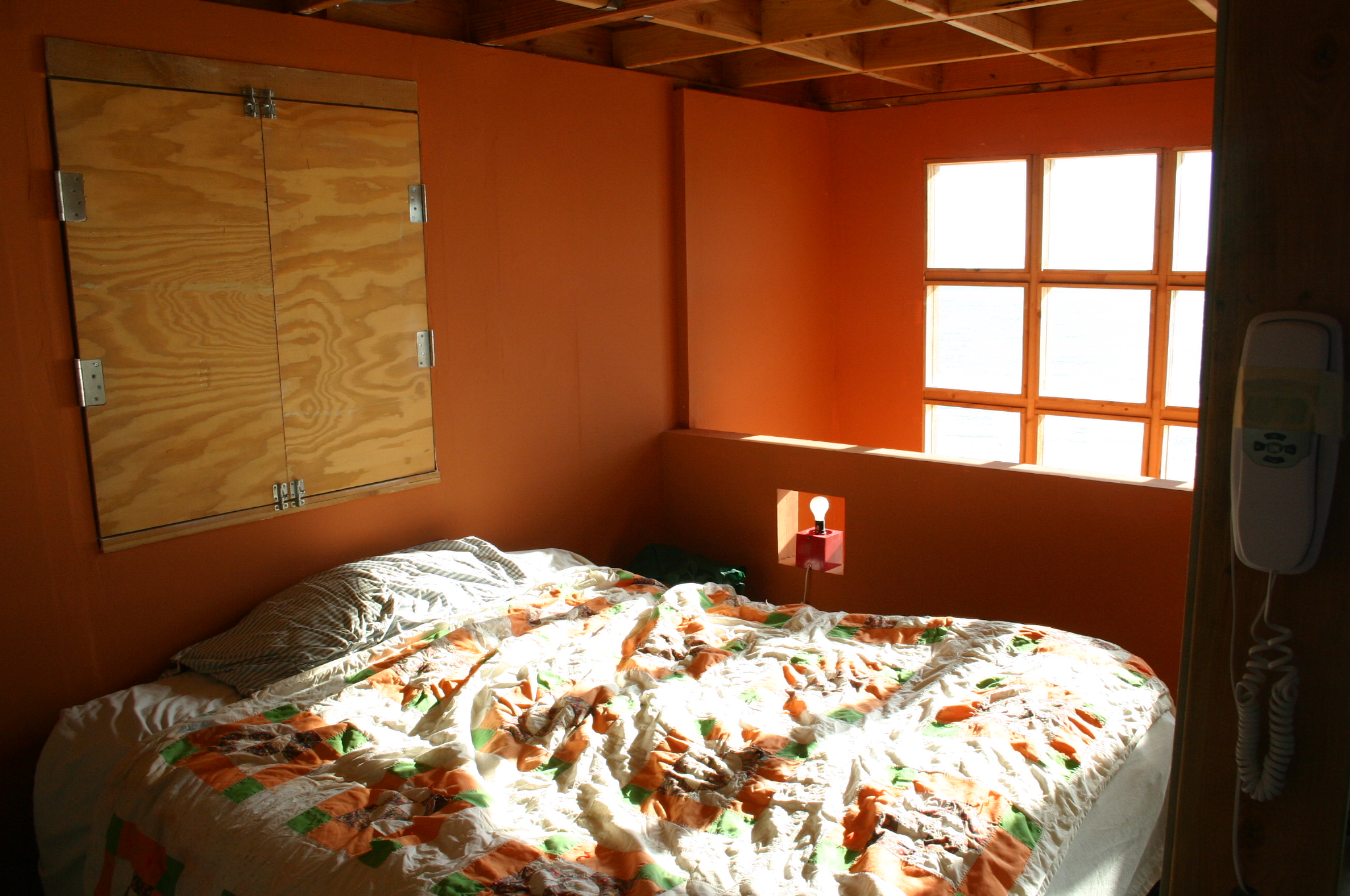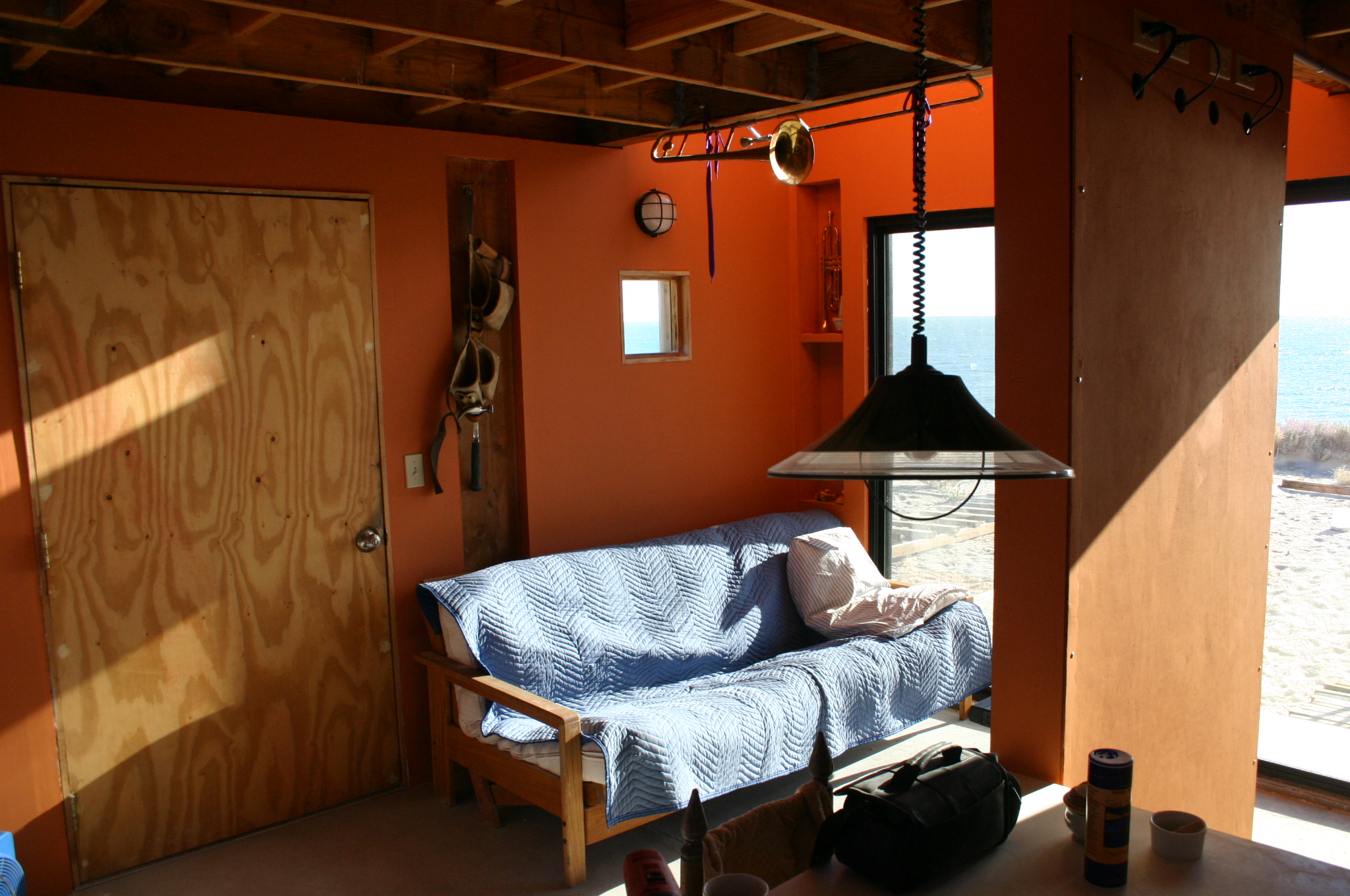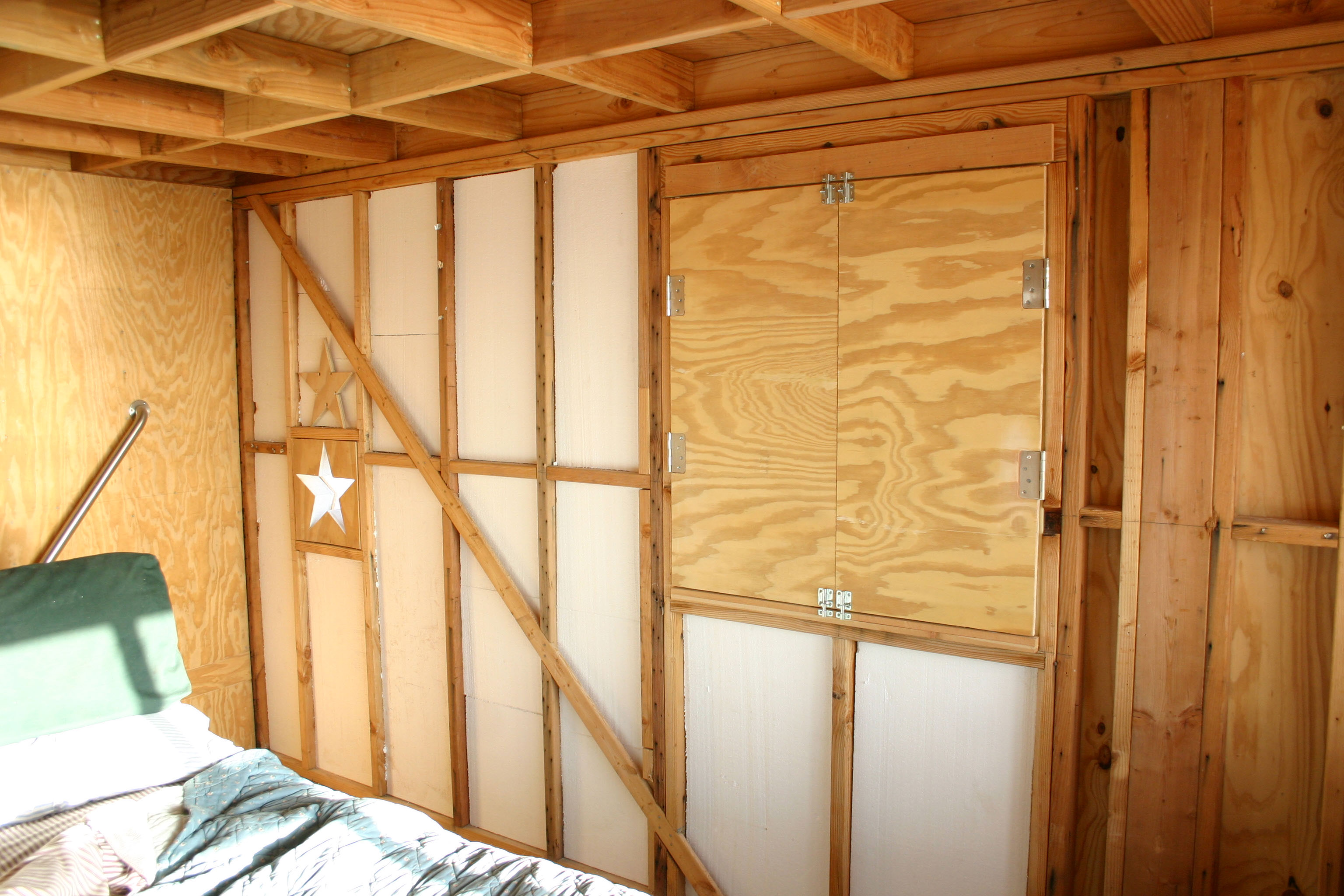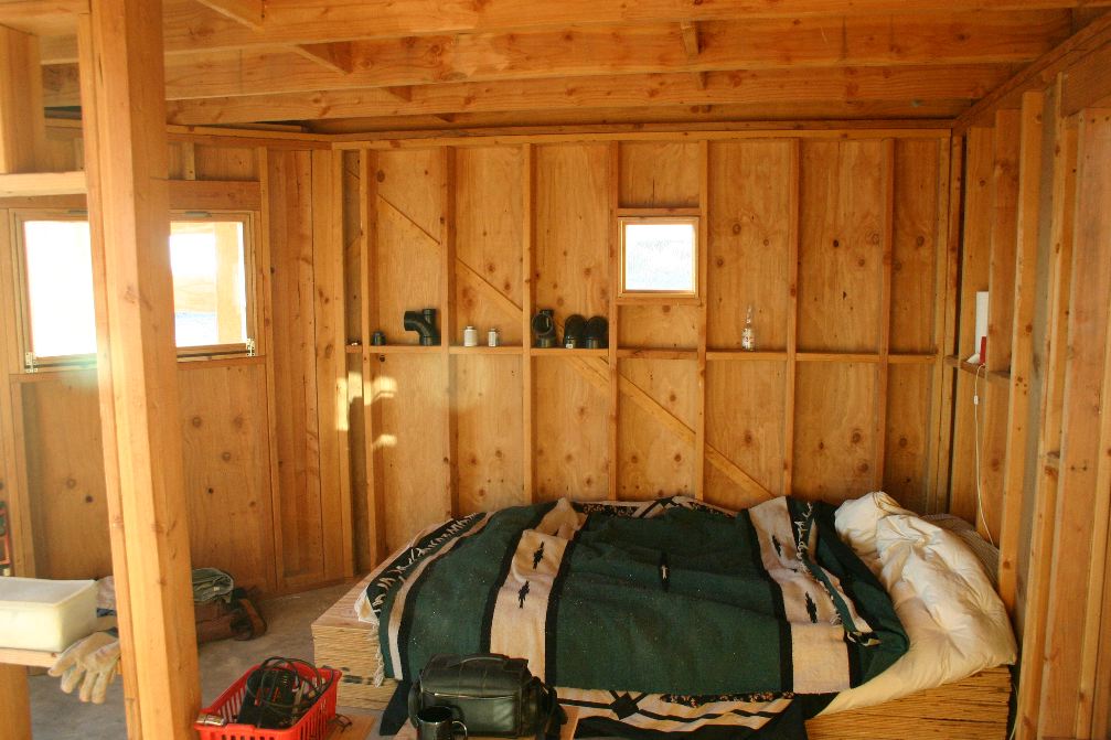 As soon as the exterior panels of the lower floor were in place, the Cube becomes a temporary bedroom. A stack of plywood panels earmarked for the upper floor provide a sleeping platform
