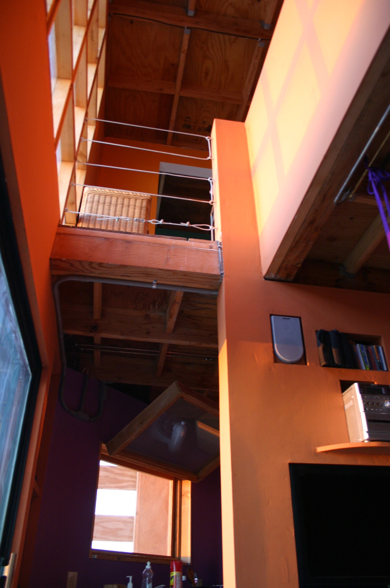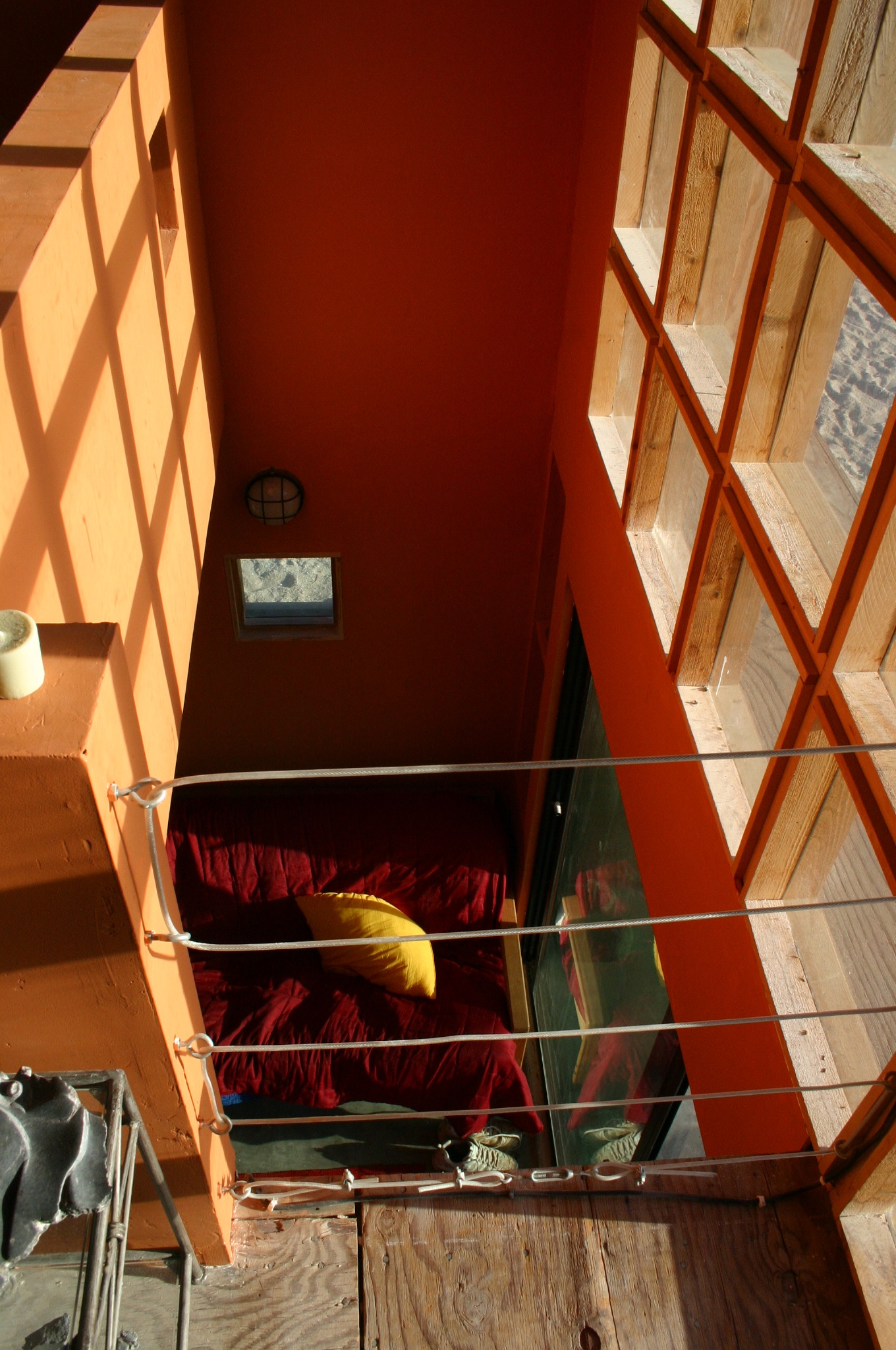 An opening in the ceiling from downstairs to the upper floor with a gallery. Looped cables provide a railing