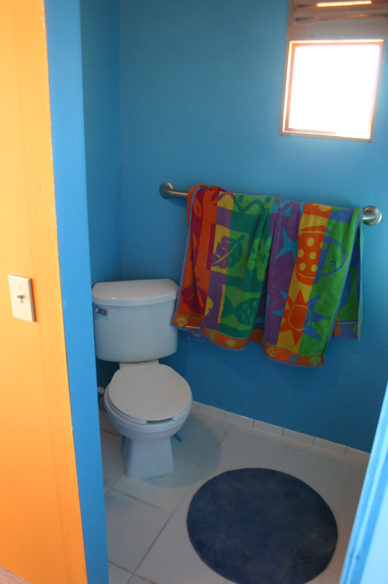 A perky paint scheme for the bathroom. The toilet is sat at 45° to save space