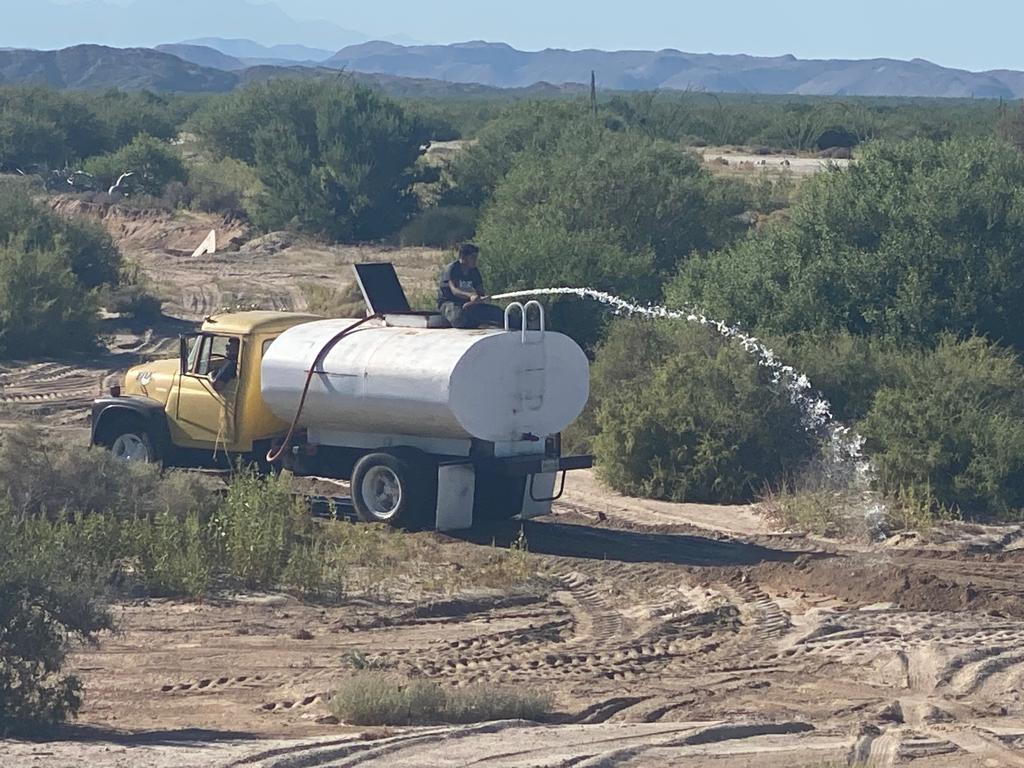 Watering down the approach road through the wash