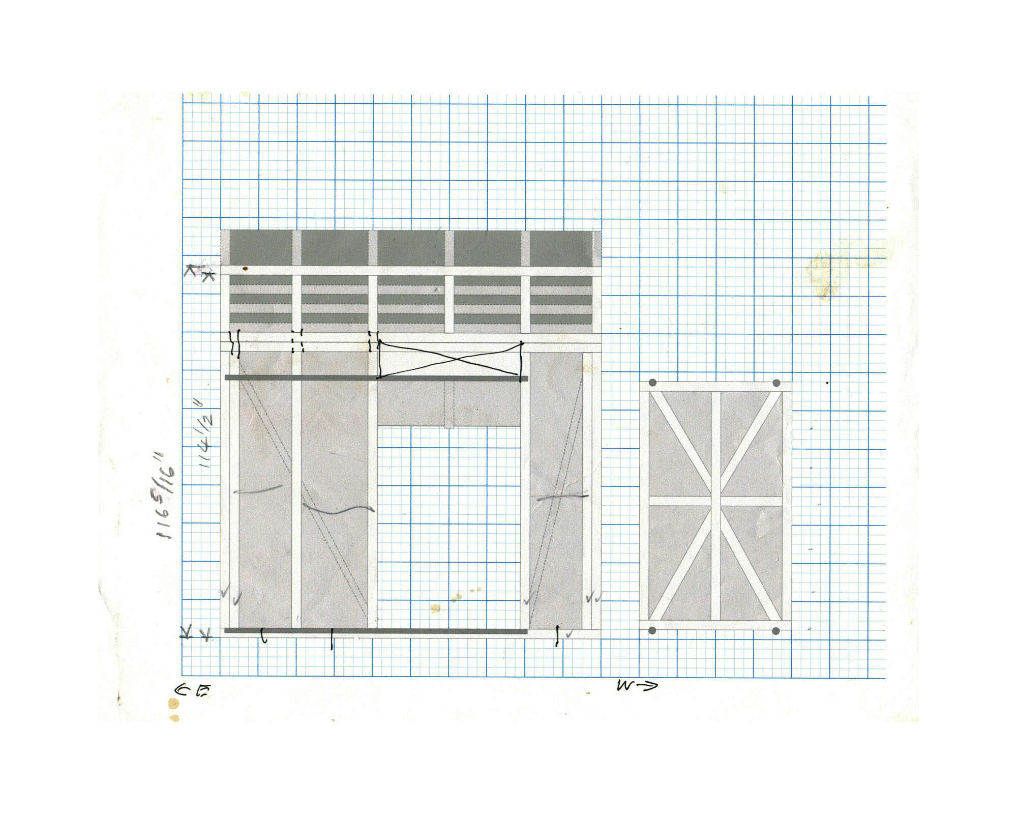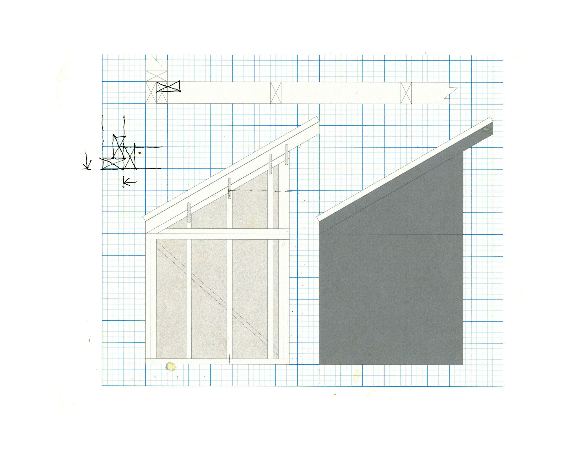 Framing plan of West wall of shed. Hand-drawn notations show the correct way to frame a corner
