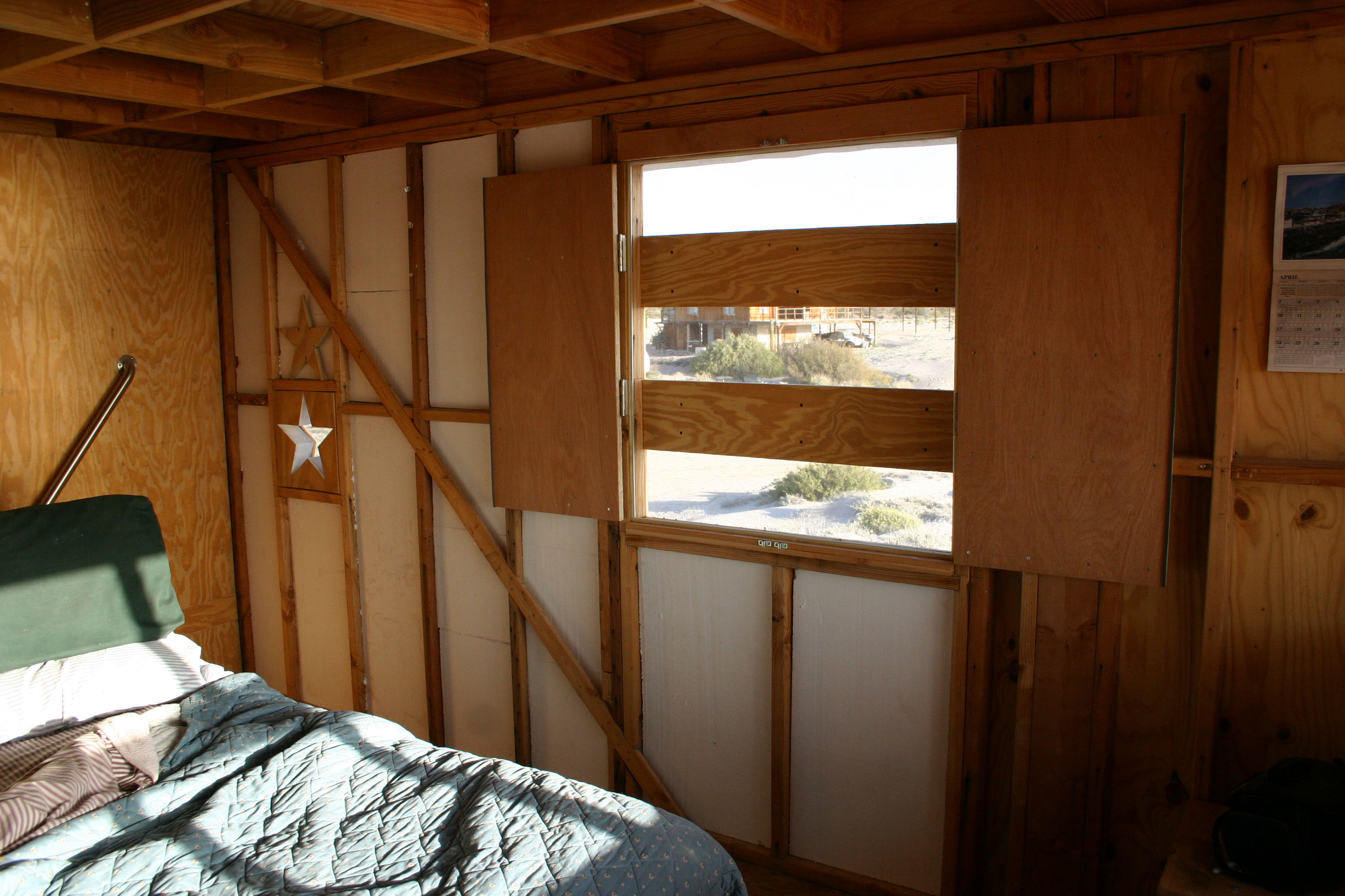 Hinged shutters surround the bedroom slatted screen window.