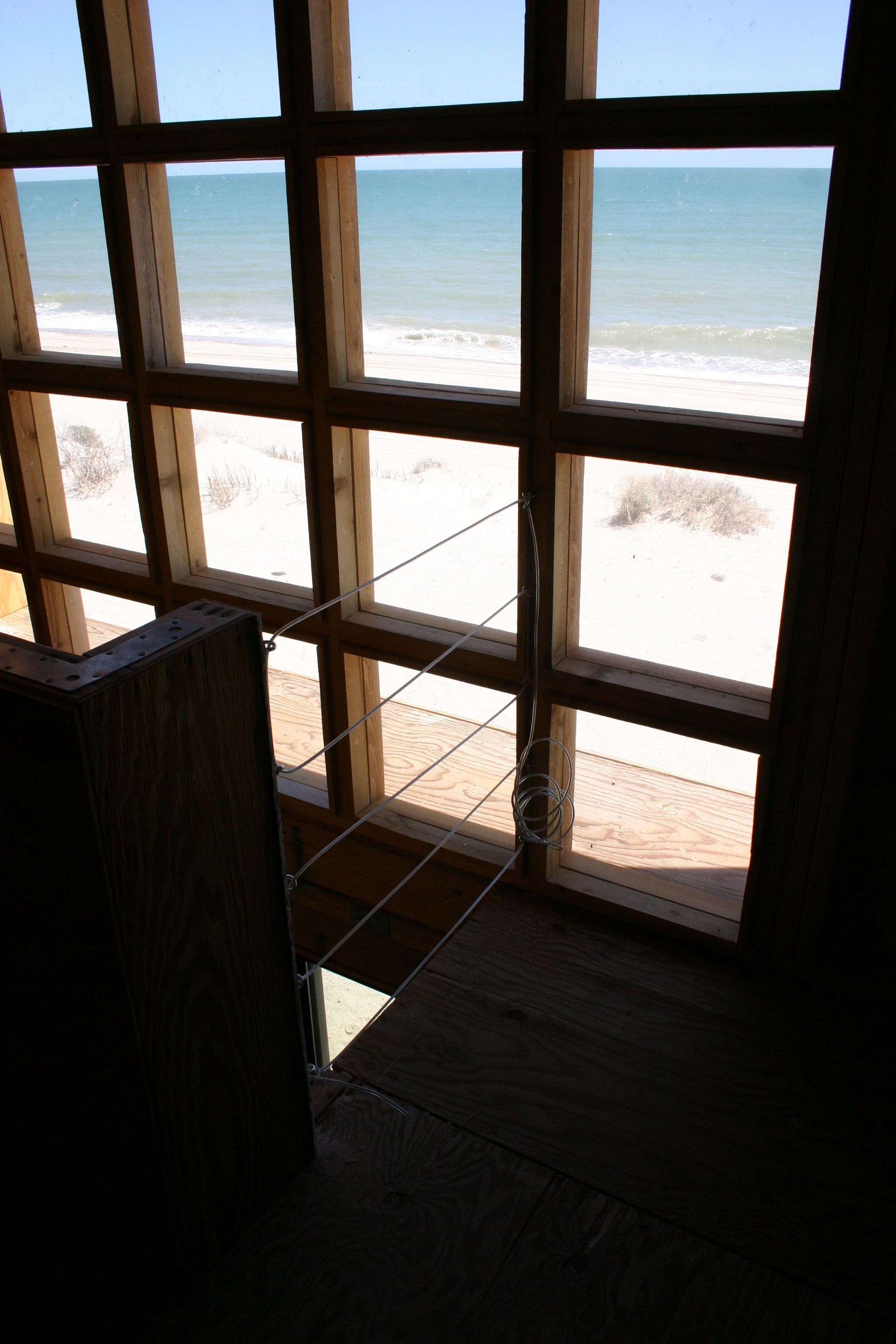 The framework for the 20-pane East window was fabricated on the concrete slab below and hoisted into position. The glass panes are held in place by cedar stops and weather-stripping