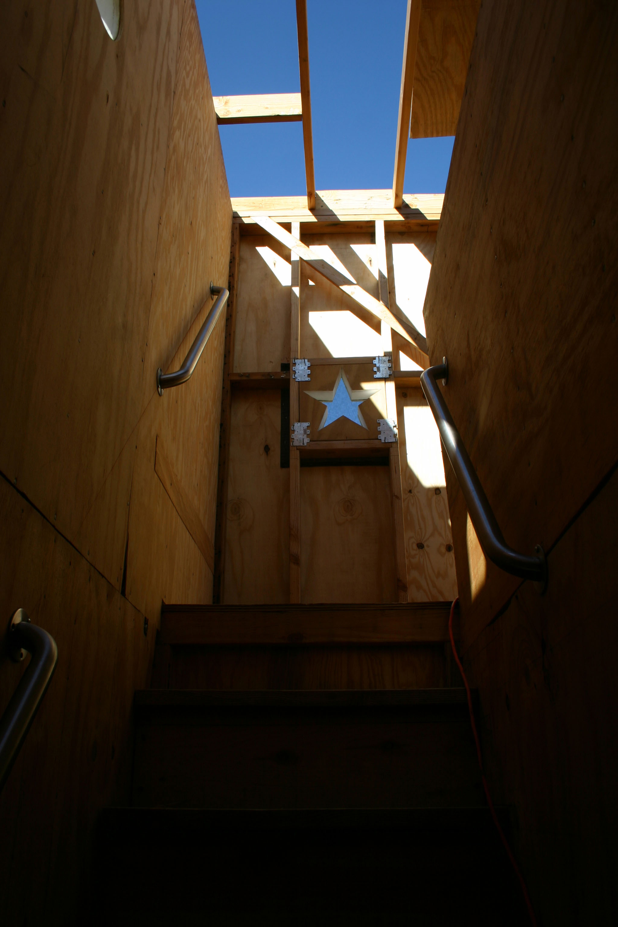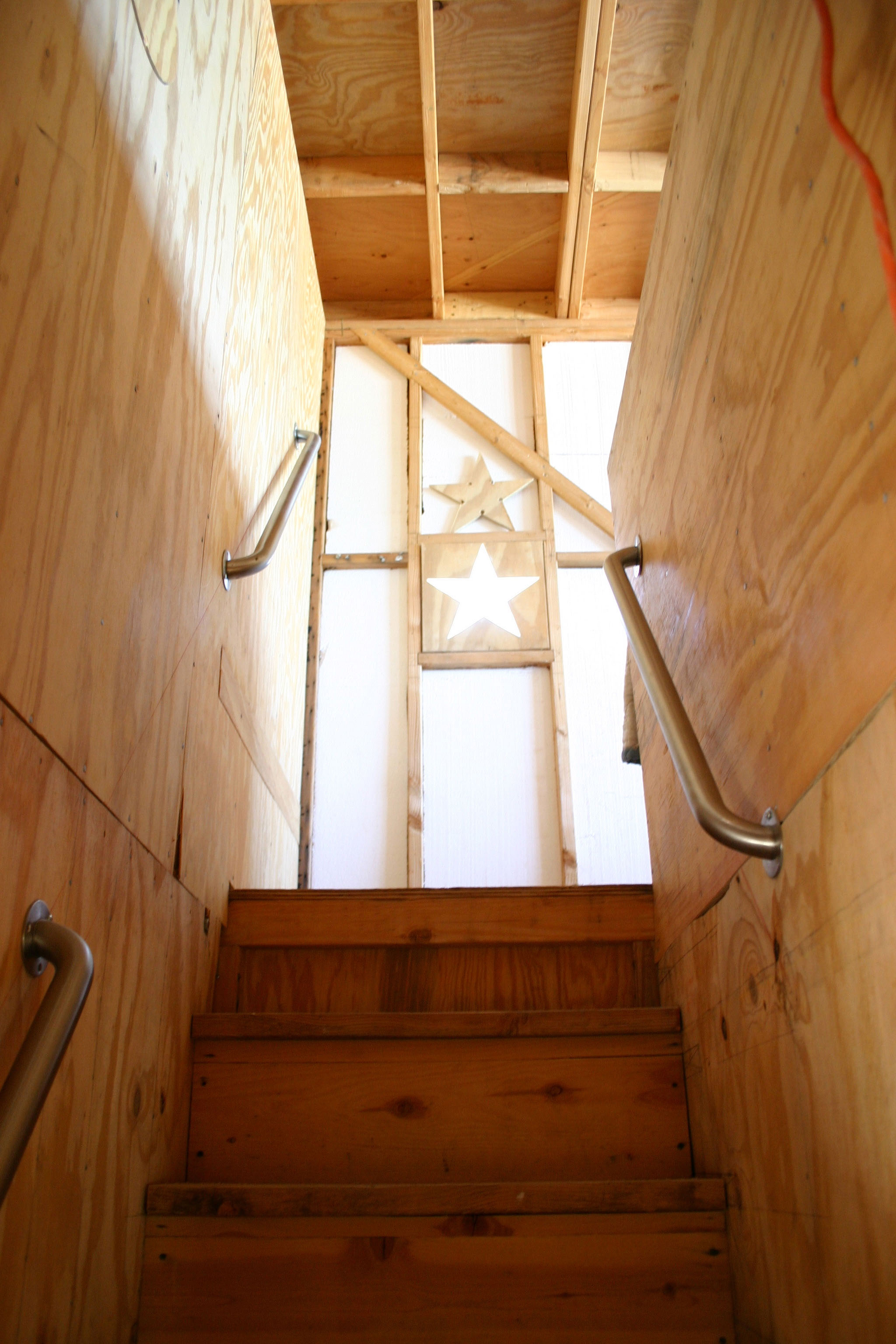The star window held temporarily in the rough opening with tie plates