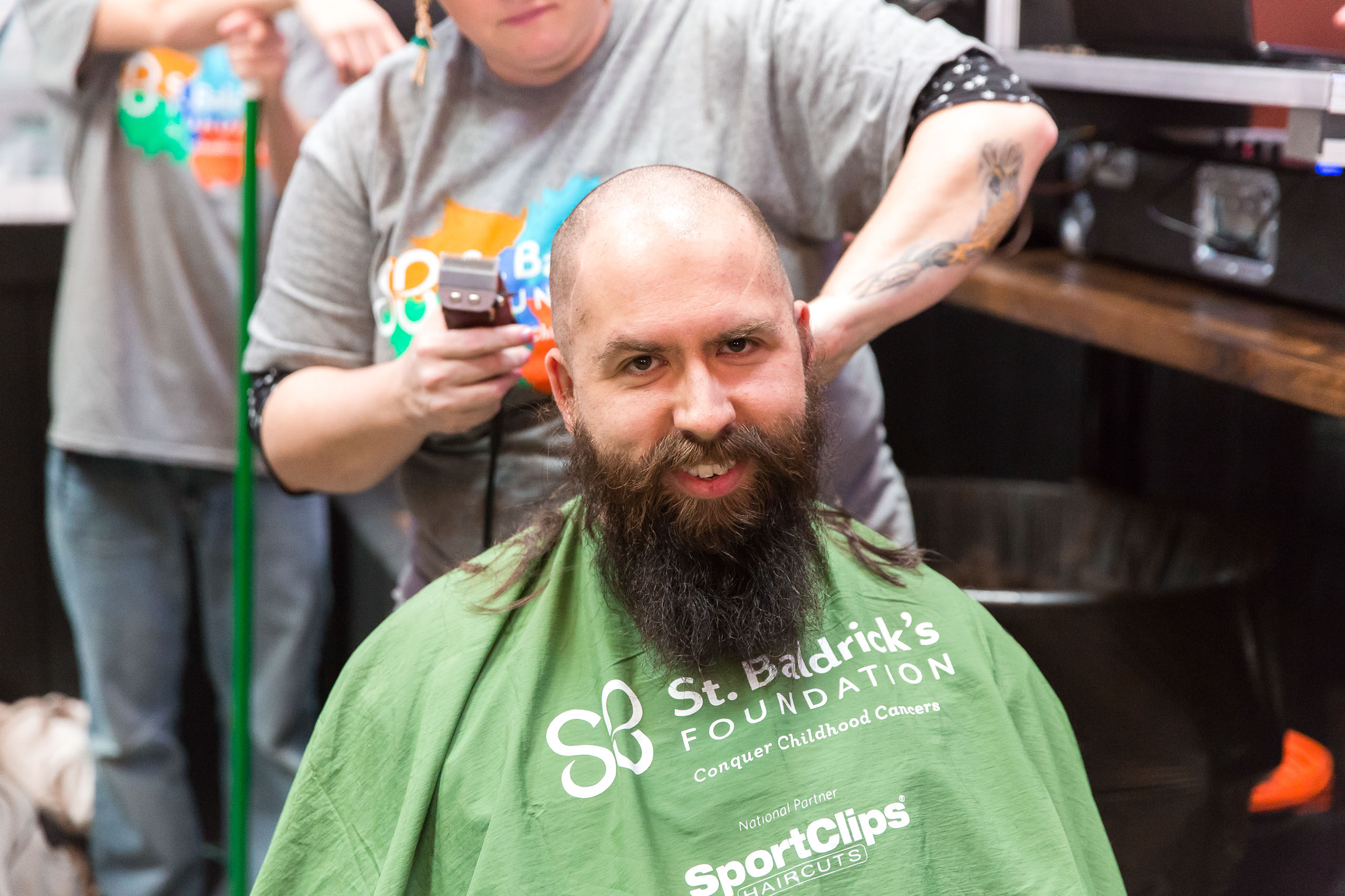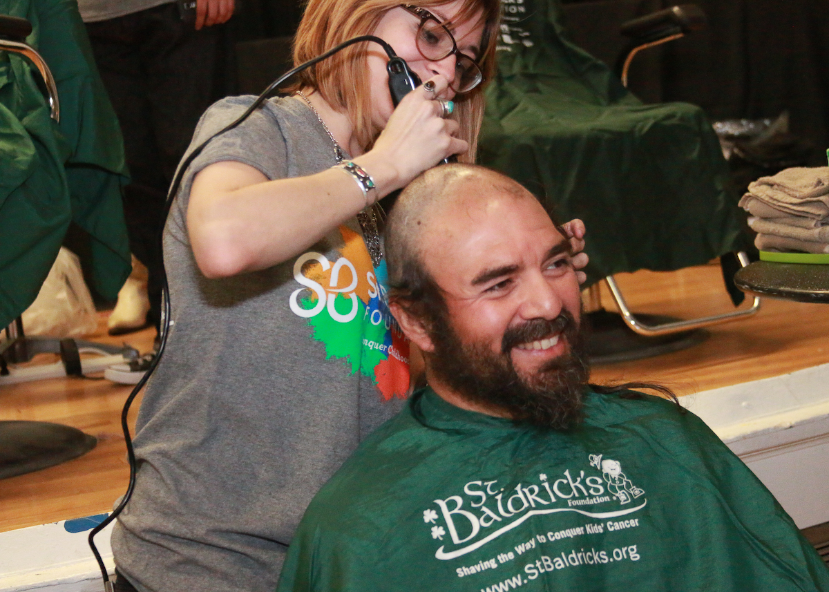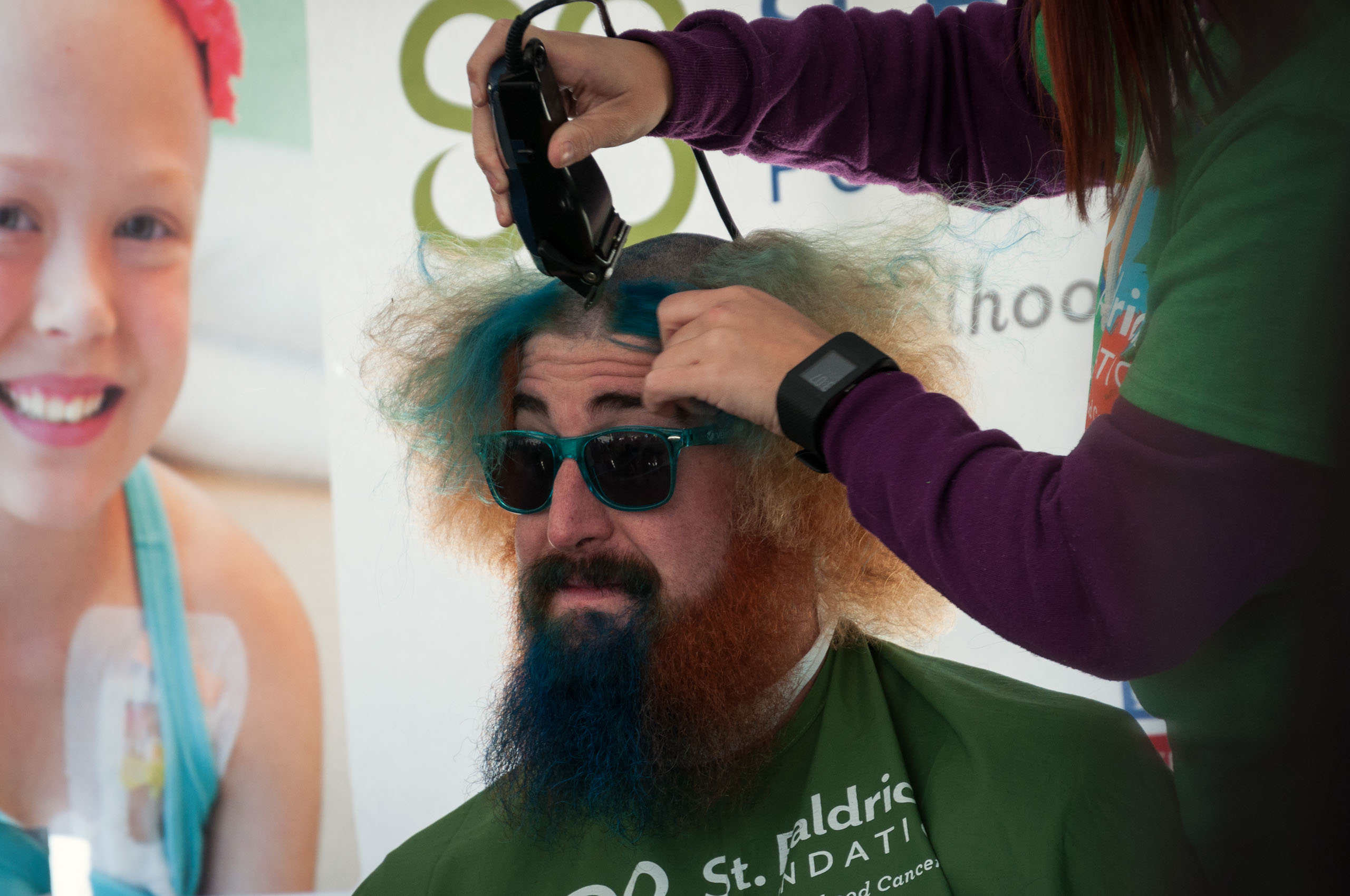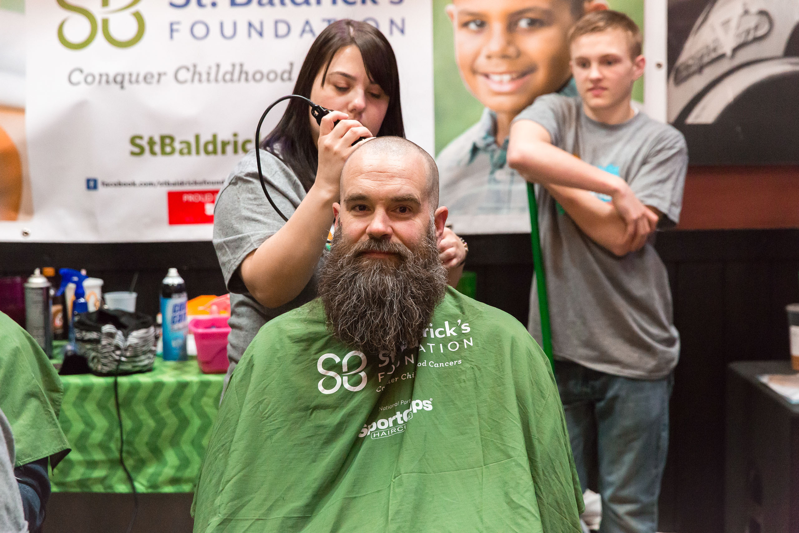 The men in the following series of photos have gallantly sacrificed their hair (but not their whiskers!) for a good cause. The St. Baldrick's Foundation is a not-for-profit organization with the aim of raising funds to help find cures for children with cancer. The name of the foundation is not associated with a recognized Saint of the Catholic Church, but is founded on word play and appropriation of the title of sainthood. Volunteers sponsored by family, friends, and employers shave their heads in solidarity with children who typically lose their hair during cancer treatment in order to raise funds.