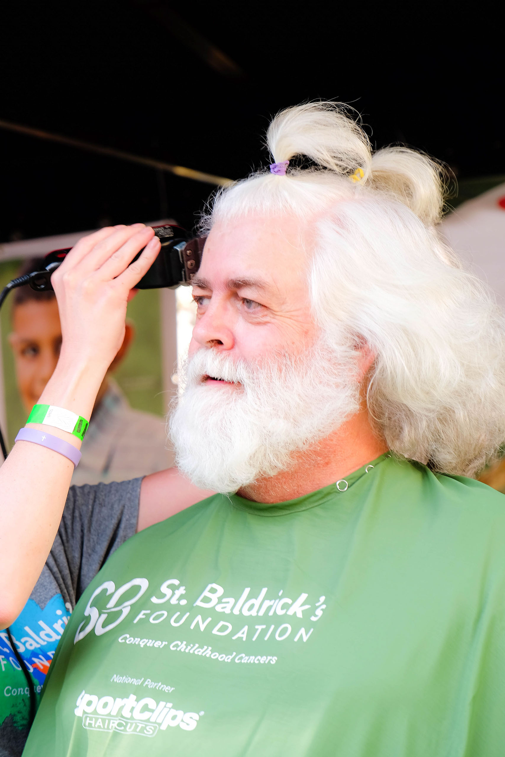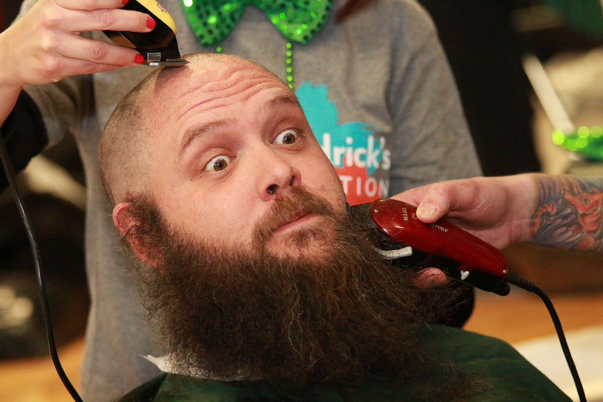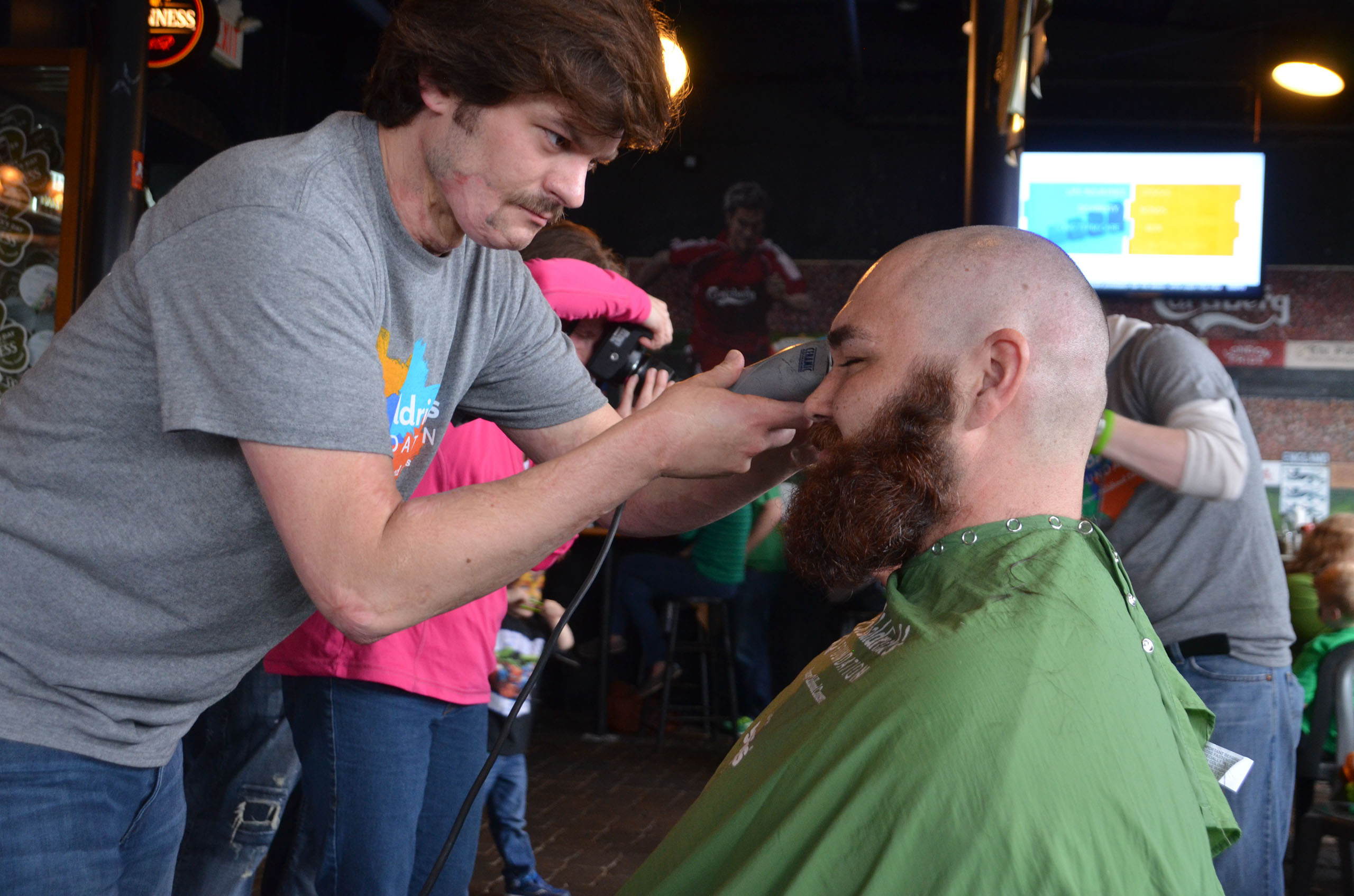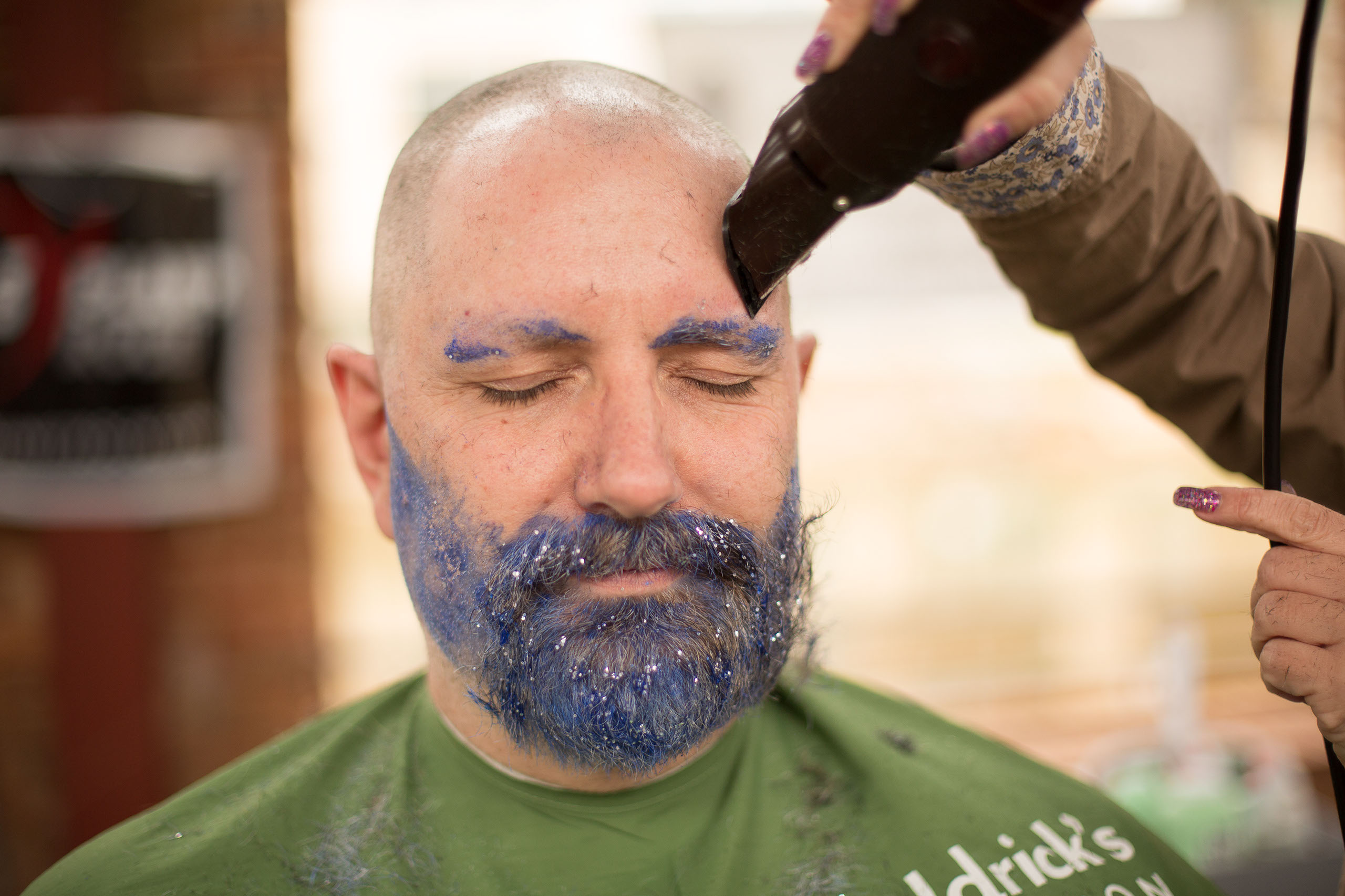 The men in the following series of photos have gallantly sacrificed their hair (but not their whiskers!) for a good cause. The St. Baldrick's Foundation is a not-for-profit organization with the aim of raising funds to help find cures for children with cancer. The name of the foundation is not associated with a recognized Saint of the Catholic Church, but is founded on word play and appropriation of the title of sainthood. Volunteers sponsored by family, friends, and employers shave their heads in solidarity with children who typically lose their hair during cancer treatment in order to raise funds.